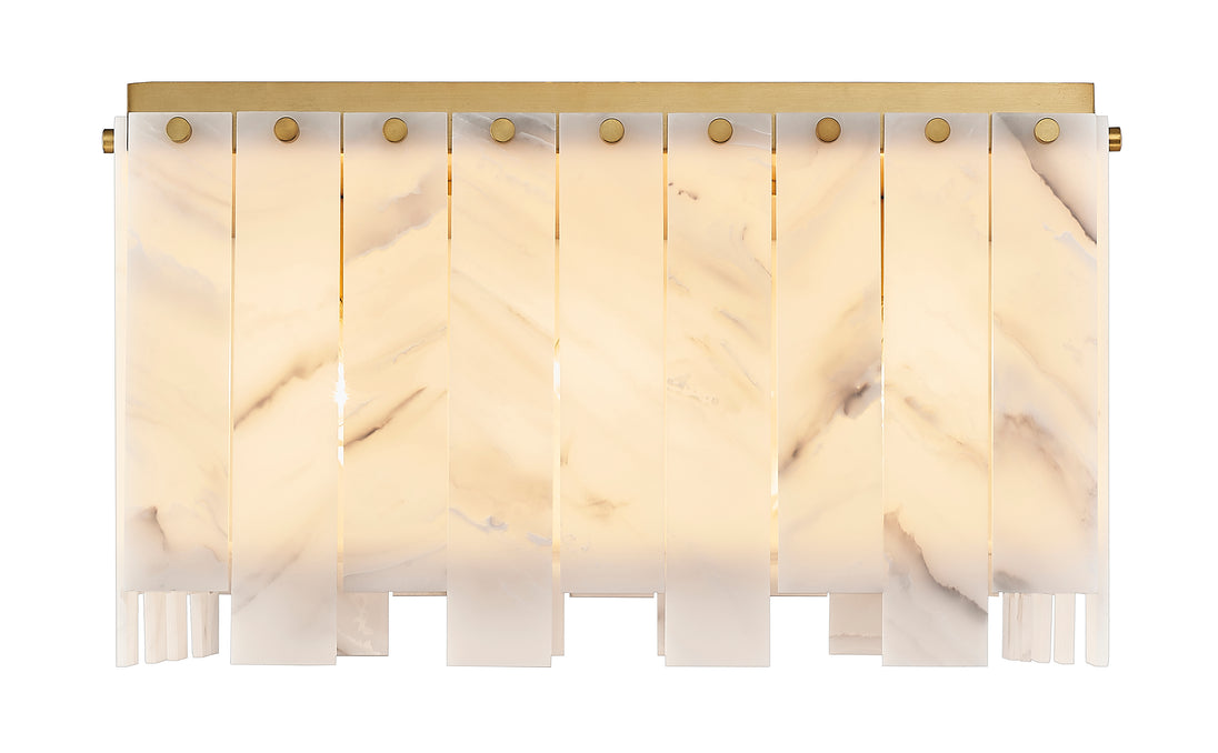 Single out a focal point in a tasteful Art Deco inspired space with this nine-light flush mount ceiling light from the Viviana collection. Tasteful and impacting design elements create impact with alabaster-like strips alternating in length and arranged around a rectangular rubbed brass finish steel frame. Whimsical rivot detailing adds an industrial feel to this flush mount light that goes with the flow as it complements a gritty rendition of toned-down glam in a kitchen or entryway.