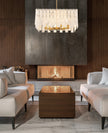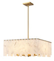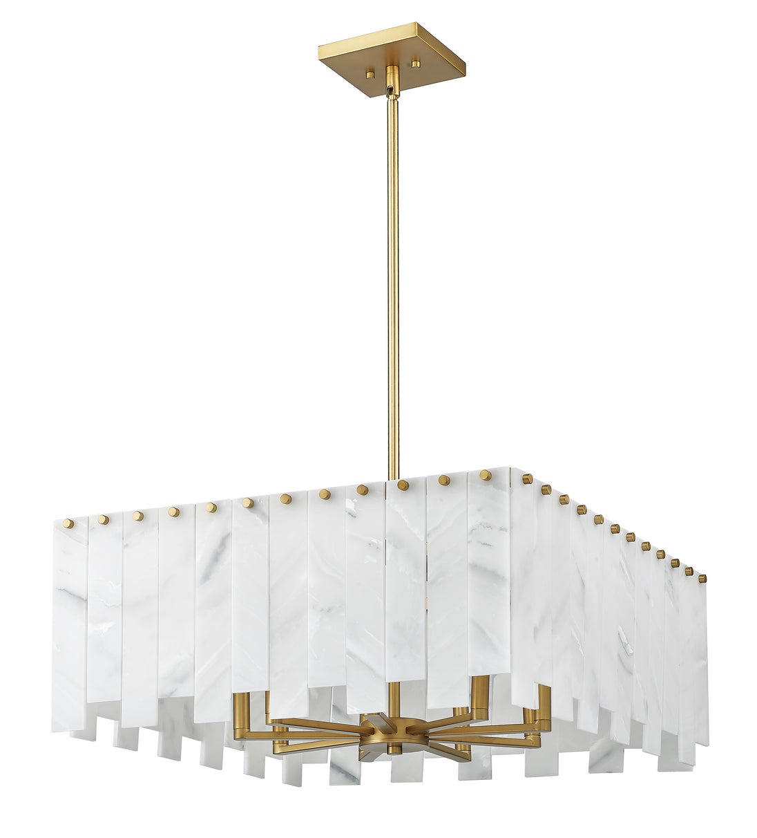 Prominent Art Deco influence pads the chic style of a fixture with an extraordinary aesthetic. Choose this decadent eight-light pendant from the Viviana collection to offer both easy palette elements and a chic look with alabaster-like strips alternating in length and arranged around a rectangular rubbed brass finish steel frame. Whimsical rivot detailing adds an industrial feel to this pendant that goes with the flow as it complements a gritty rendition of toned-down glam in a kitchen or entryway.