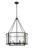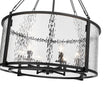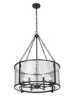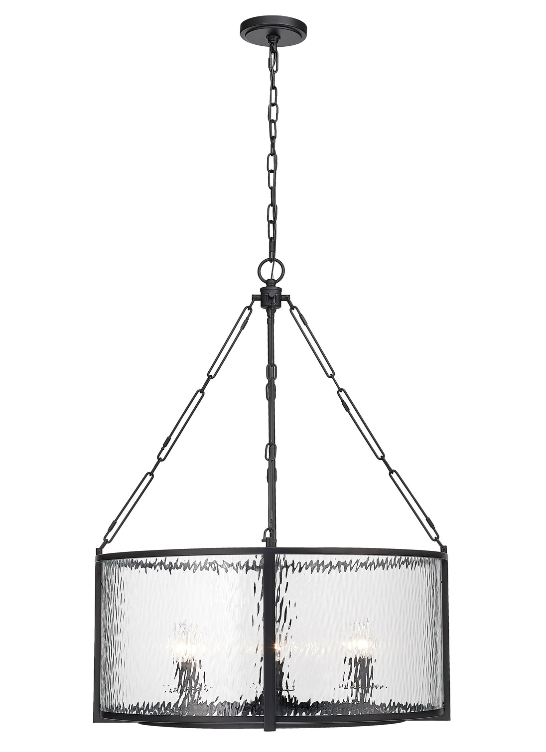 An unmistakable statement-making vibe becomes a focal point in any space when this captivating fixture delivers glowing ambient light with its own dramatic stamp. This six-light pendant from the Barrington collection is styled around an enticing energy and an industrial motif with a round cage made of matte black finish steel framing clear waterglass that distorts a view of romantic candelabra bulbs creating a castle-inspired look. Removable chain links and rod allow for a reduction in fixture height to 25.75" if desired.