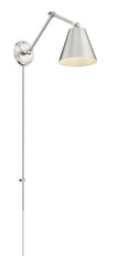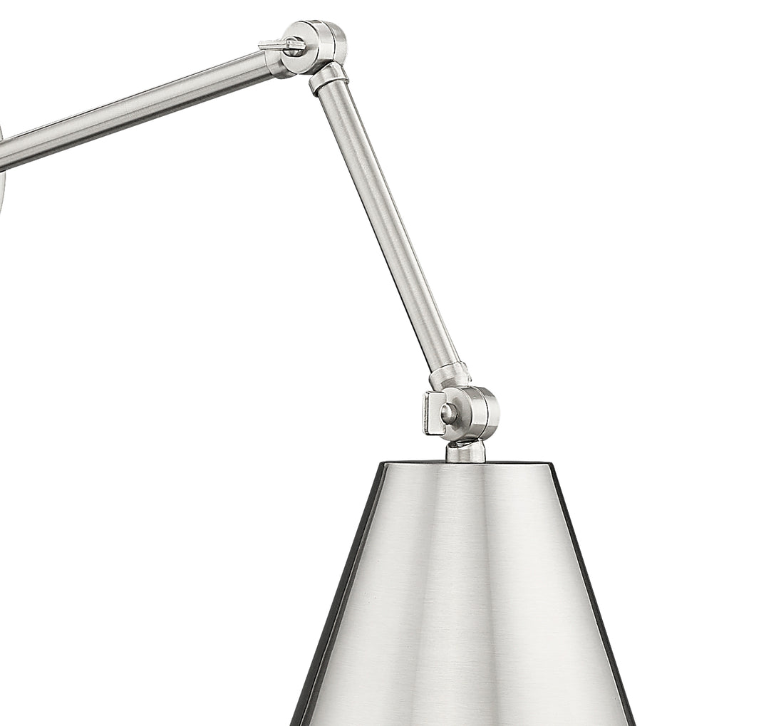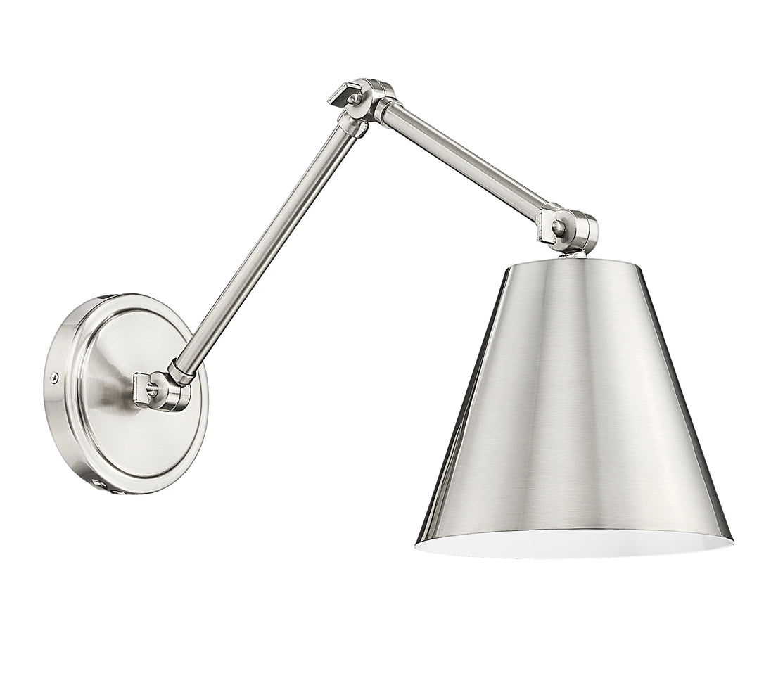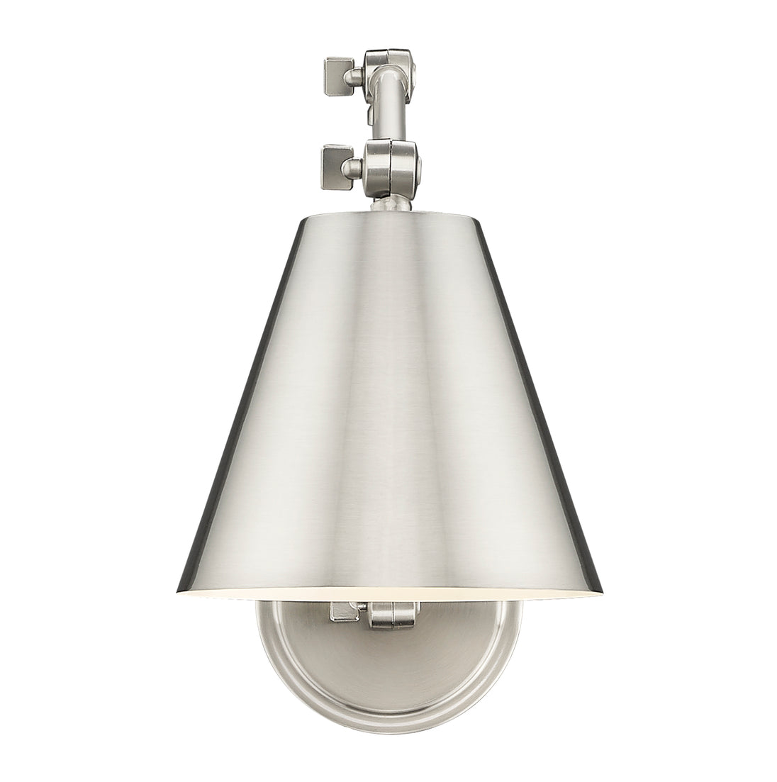 A cool brushed nickel finish begins a traditional motif with flexibility and versatility in this one-light wall sconce. Steel construction is true to its functional aesthetic, making the most of a wall-mounted sconce offering adjustable positioning of a cone shade. This fixture makes an excellent light for reading and task-mastering, as well as mood lighting ideal for a low-key setting. Install through hard-wiring or install cord-and-plug mounting to allow movement from space to space.
