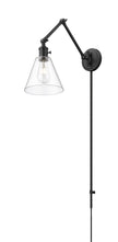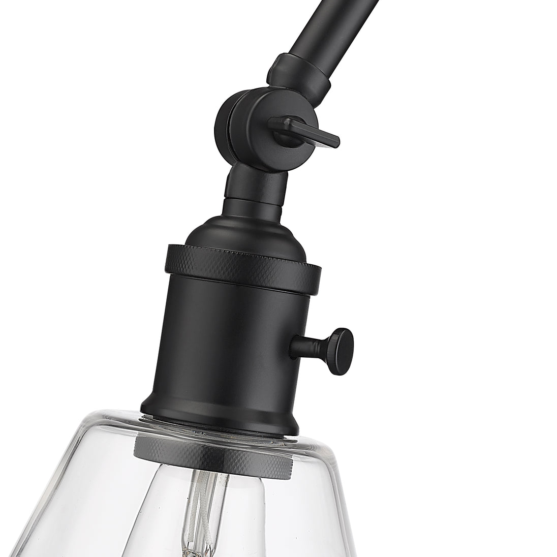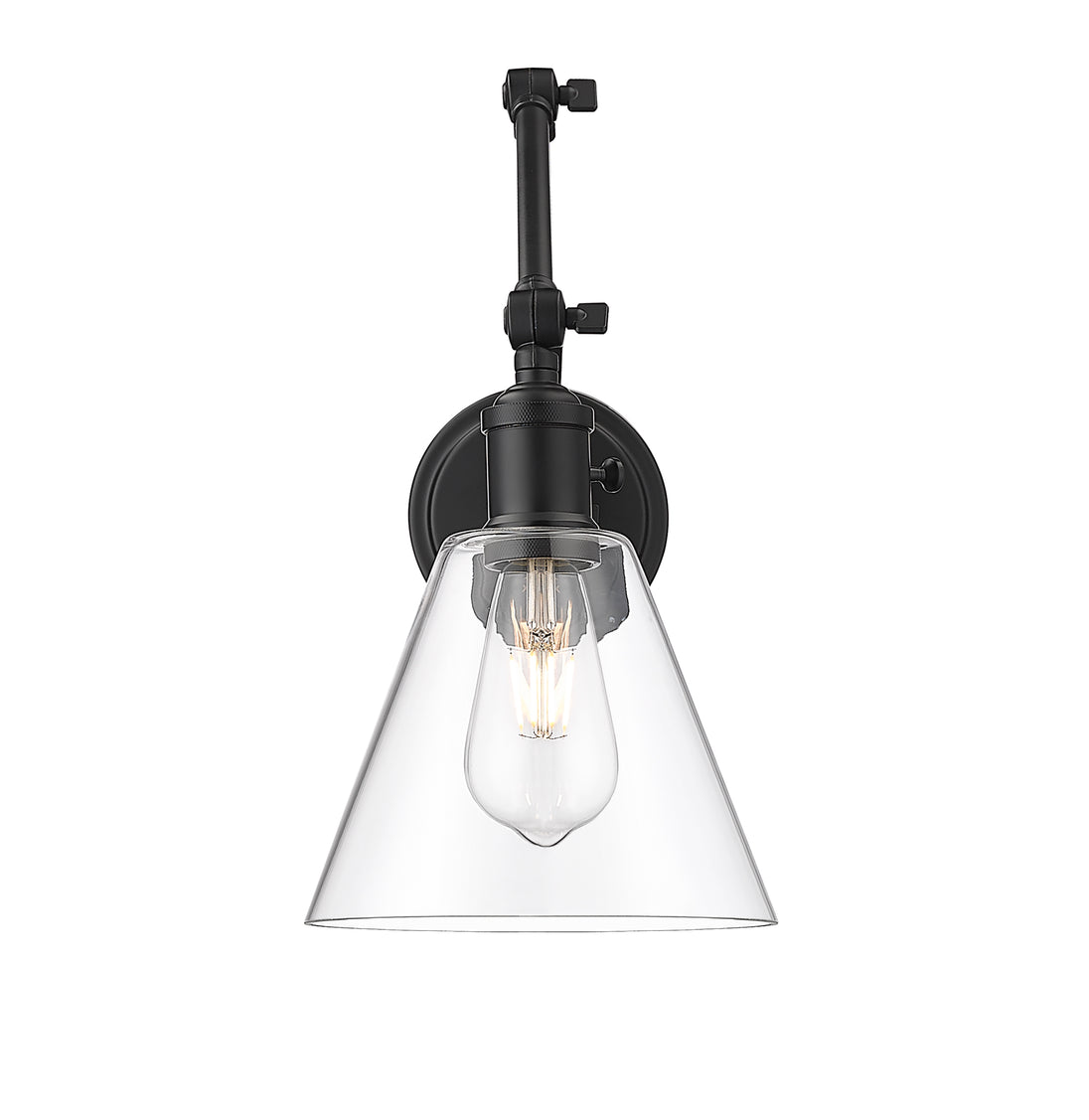 Mixed motifs offer an exquisite form of industrial style in a one-light wall sconce offering the perfect blend of glam and industrial design aesthetics. Constructed of bold matte black finish steel framing and a conical clear glass shade, it delivers utility in an adjustable configuration making it easy to achieve customizable lighting levels. Install through hard-wiring or install cord-and-plug mounting to allow movement from space to space.