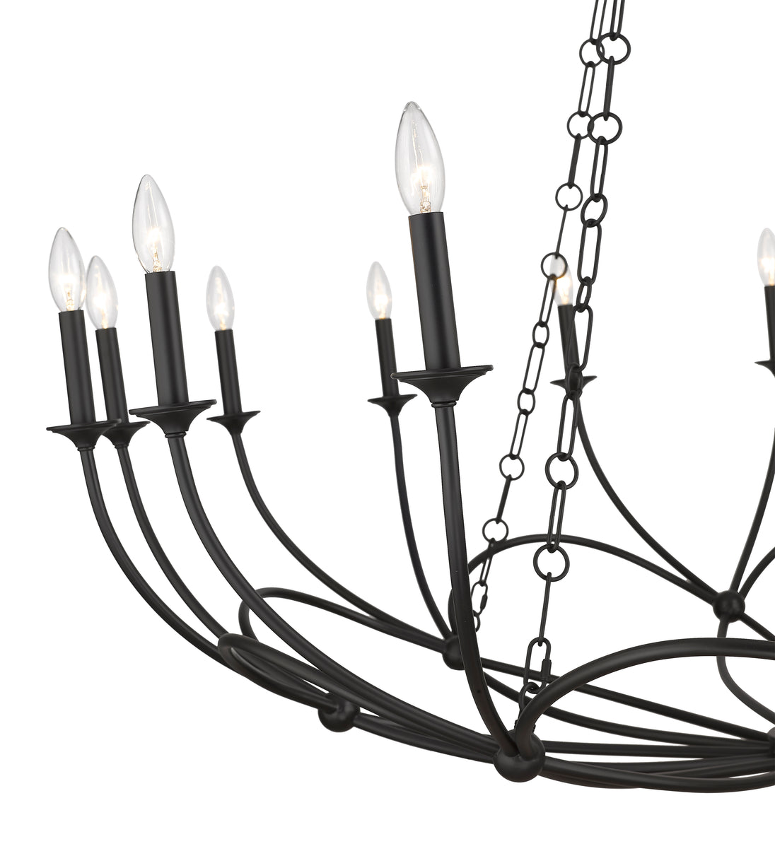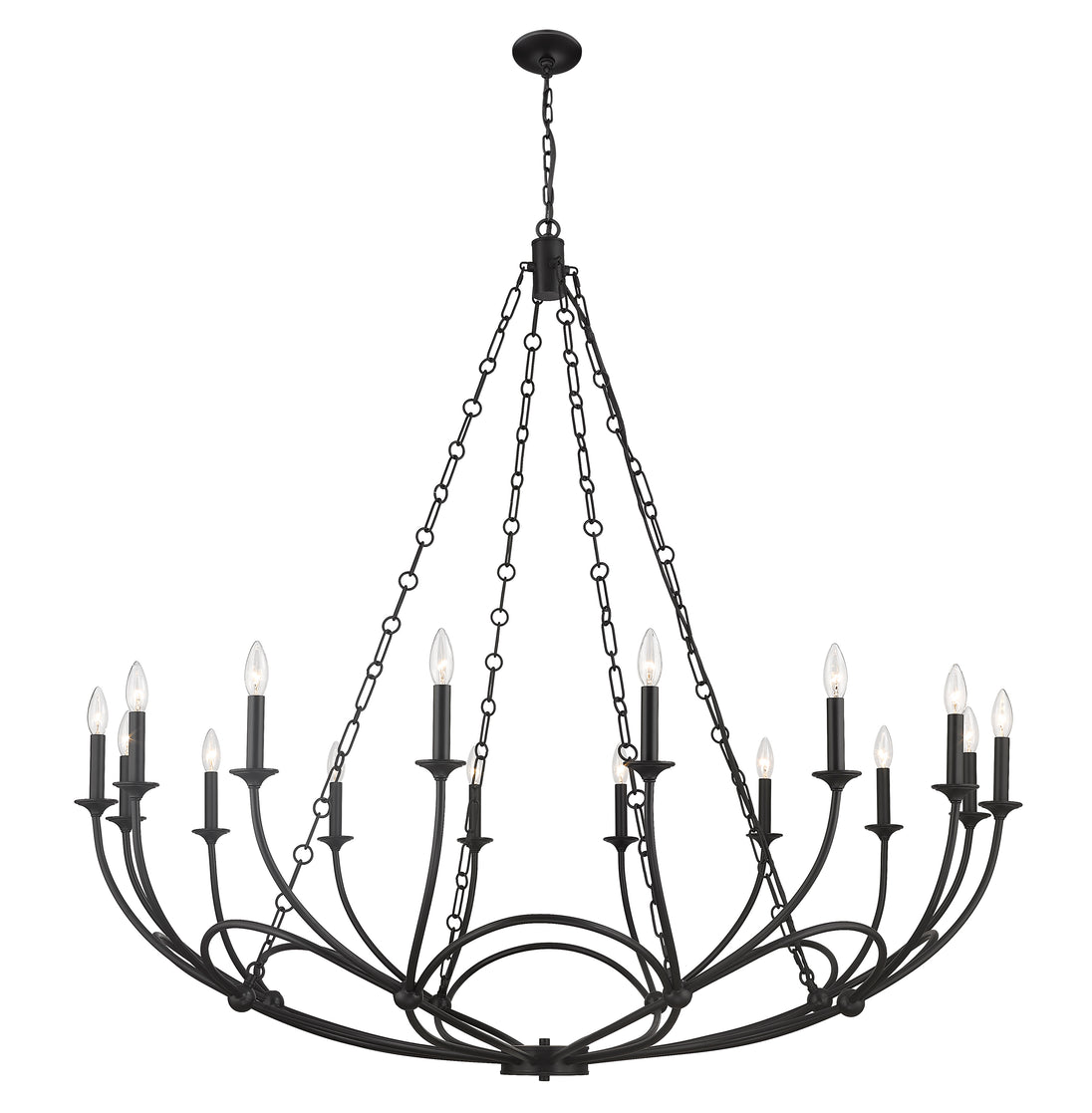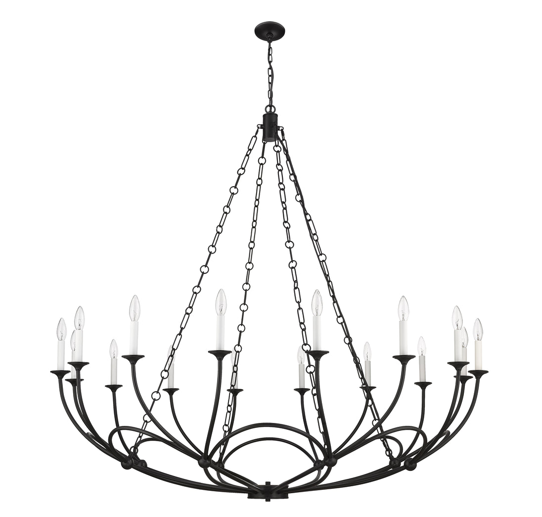 A perfect marriage of gallery-inspired artistry and theatrical drama meets in the middle to deliver an unforgettable look in interior lighting perfect for a grand dining space or foyer. From the Arabella Collection, this 16-light chandelier maintains a light, symmetrical motif in spite of its bold matte black finish steel construction. A ribbon-like design accents its chicly arched frame with charming candelabra bulb mounts that soften edgy character.