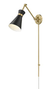 Mid-Century inspired tuxedo style highlights a charming wall sconce. Its metal shade showcases an hourglass profile, complete with an articulating arm for easy adjustment and precise lighting. Modern gold is the perfect finish accent, offering a rich, refined look and feel with a matte black shade, complementing in any setting. Install through hard-wiring or install cord-and-plug mounting to allow movement from space to space.