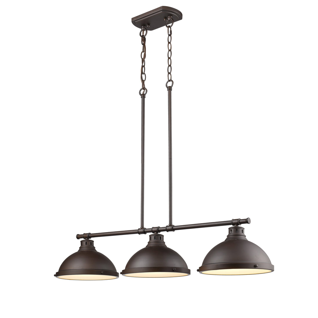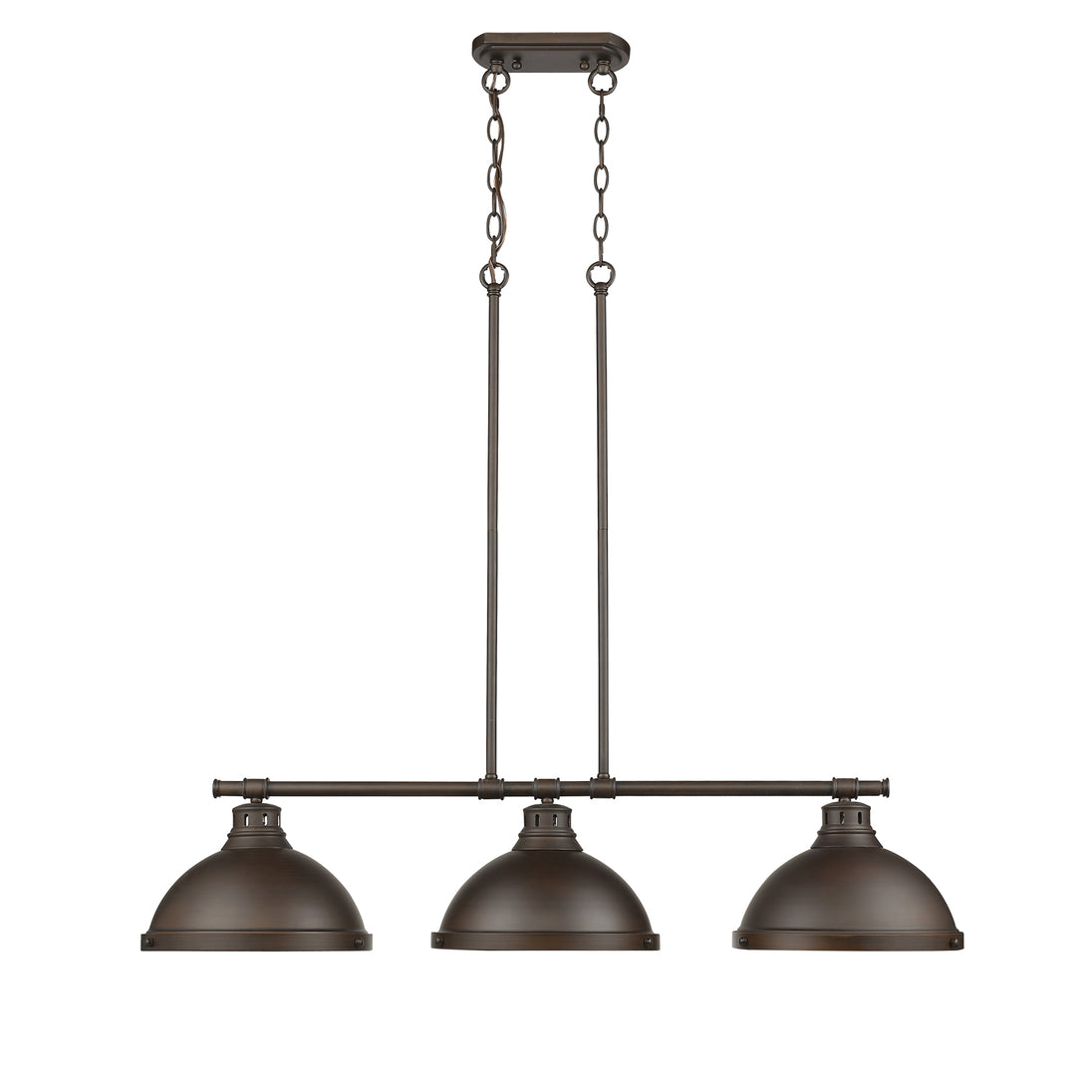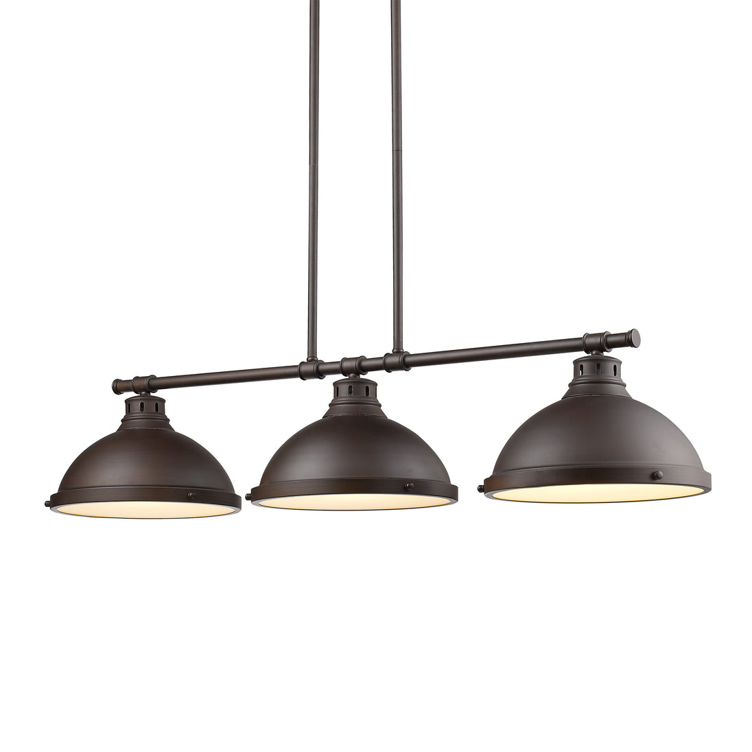 The Yep by Golden Lighting Duncan 3-light Island Light combines traditional and farmhouse design with rubbed bronze and a metal shade, creating an inviting glow that elevates kitchens and dining areas.