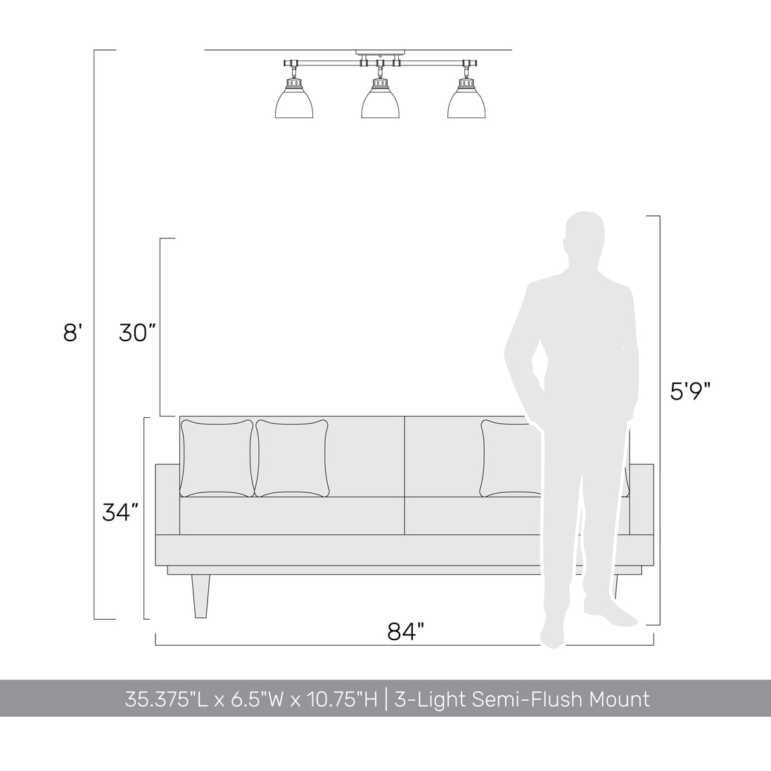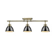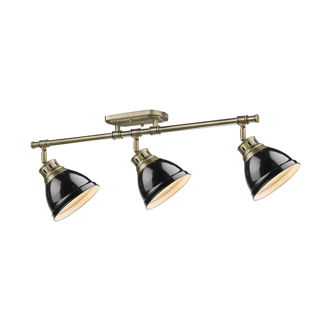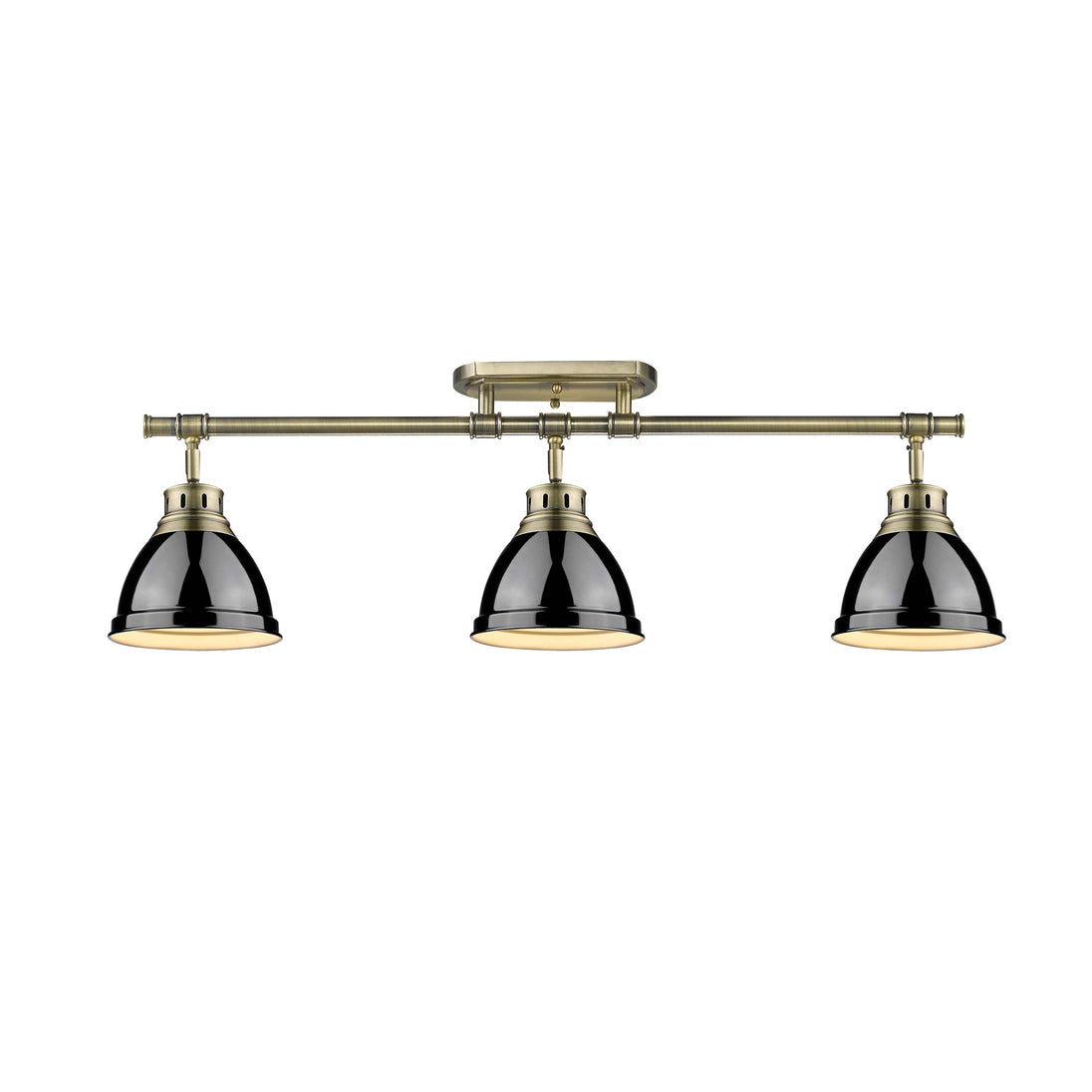 Elevate your interior with the Yep by Golden Lighting Duncan 3-light Semi-Flush Mount. This stunning fixture combines an aged brass frame with a bold black metal shade, enhancing your home with a contemporary yet classic style. The sleek black shade shines with a glossy finish, reflecting light and creating an impactful visual statement. Its smooth surface adds a touch of modern glamour while beautifully contrasting with the warmth of the aged brass. Ideal for entryways, bedrooms, kitchens, and living areas with mid-height ceilings, this fixture is rated for damp locations, making it suitable for areas with occasional moisture. The adjustable directional heads allow you to customize your lighting, providing focused illumination where you need it. With overall dimensions of 35.38"W x 10.75"H x 6.5"D, this semi-flush mount requires three E26 medium base bulbs (not included), each with a maximum wattage of 100 for bright, effective lighting. Infuse your space with modern sophistication and timeless appeal, showcasing your aesthetic with quality craftsmanship.