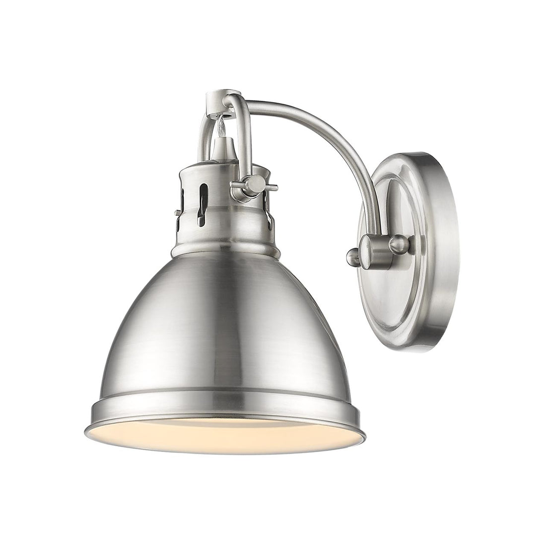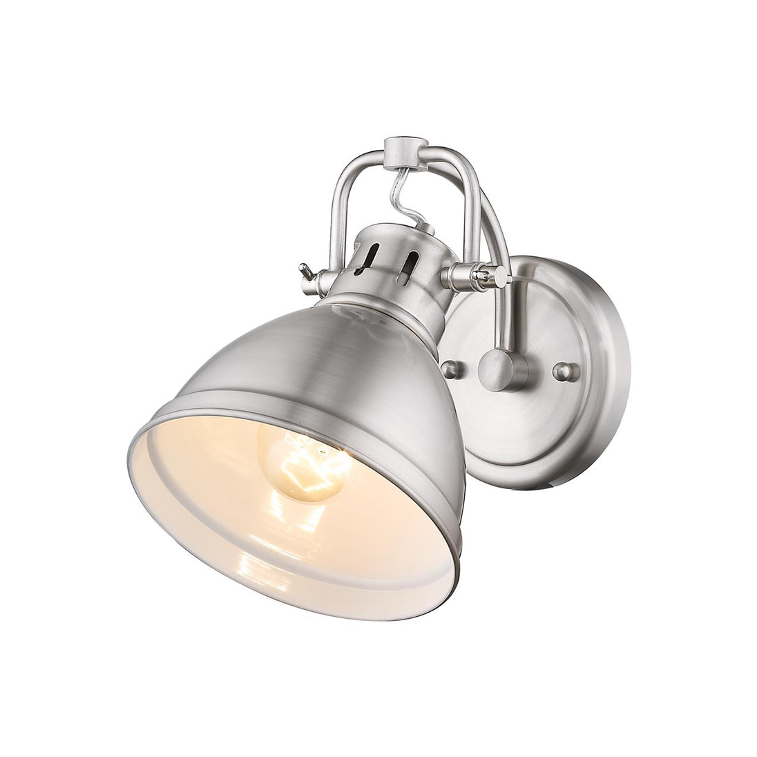 Bring traditional elegance into your home with the Yep by Golden Lighting Duncan 1-light Vanity. Featuring a pewter metal shade and a pewter frame, it creates a warm and inviting atmosphere. The pewter shade displays a medium-toned, warm silver-grey color with a uniform satin lustre, enhancing any space with its polished light effect. Our Pewter finish offers a soft and classic alternative to brighter silver tones, making it a versatile option for both classic and contemporary interiors. Brighten up bathrooms with dedicated lighting that flatters while providing practical task illumination. Rated for damp locations, this fixture works perfectly in areas with occasional moisture. The adjustable directional heads allow for customization to spotlight specific areas or objects. Overall Dimensions: 6.5"W x 8.5"H x 8.25"D. Requires 1 E26 Medium base bulb (not included), max wattage 100. The Duncan vanity light is a choice that adds both style and functionality to your bathroom space.