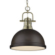 Bring rustic elegance into your home with the Yep by Golden Lighting Duncan 1-light 14in Chain Hung Pendant. Featuring a metal shade and a striking aged brass frame, it creates a warm and inviting atmosphere. The rubbed bronze shade complements the brass perfectly, bringing a touch of classic warmth with a brushed texture that reveals subtle highlights. Embrace the timeless beauty of the Aged Brass finish with its vintage elegance, creating character for traditional, transitional, or industrial spaces. Ideal for kitchens, dining areas, or bedrooms, this pendant light is damp location rated, allowing installation in covered porches or bathrooms. The fixture accommodates sloped ceilings and has an adjustable height from 19.875" to 91.875". With dimensions of 14"W x 16.88"H x 14"D, it requires one E26 medium base bulb (not included) with a maximum wattage of 100. Transform your home with quality lighting that radiates warmth and charm.