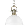 Bring traditional elegance into your home with the Yep by Golden Lighting Duncan 1-light 14in Chain Hung Pendant. This exquisite piece features a metal shade and a sophisticated aged brass frame, creating a welcoming atmosphere. The matte white metal shade has a velvety, non-reflective surface that beautifully absorbs light, enhancing the clean lines and modern appeal of the fixture. Embrace timeless elegance with the aged brass finish, which offers a warm glow, perfect for kitchens, dining rooms, or entryways. Damp location rated, this pendant is suitable for covered spaces and is easily adjustable for sloped ceilings. Its dimensions are 14"W x 16.88"H x 14"D, requiring 1 E26 Medium base bulb (not included) with a maximum wattage of 100. Experience the perfect balance of style and functionality with this charming lighting fixture.