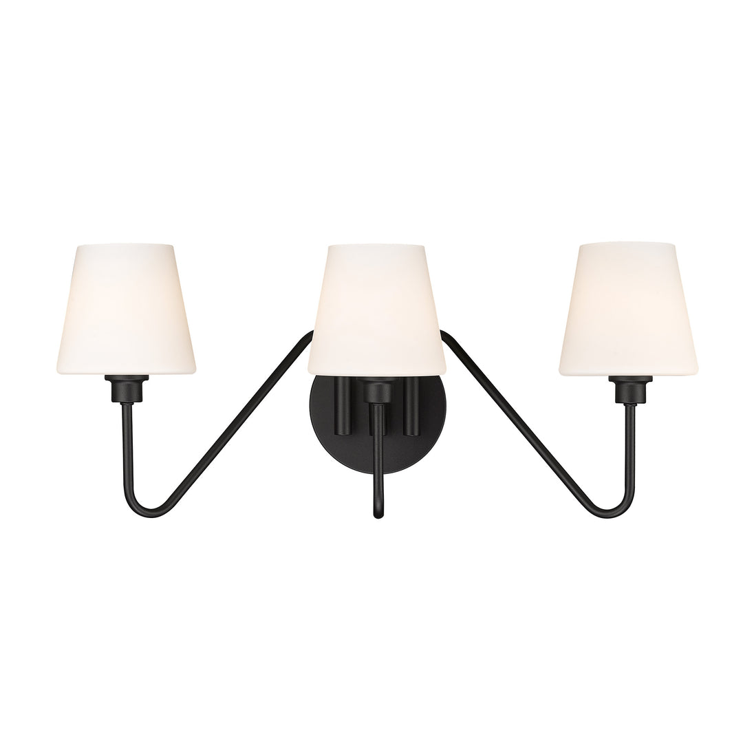 Bring transitional elegance into your home with the Yep by Golden Lighting Kennedy 3-light Vanity in Natural Black. Featuring Opal Glass shades and a Natural Black frame, it creates a welcoming atmosphere perfect for any bathroom. The Opal Glass shades diffuse light evenly, creating a soft, glare-free glow that enhances the ambiance of your space. Our Natural Black finish offers a softer take on traditional dark colors, with a tactile, grounded feel that complements various design styles. This vanity light is damp location rated and ideal for spaces with occasional moisture. Requires 3 E12 Candelabra base bulbs (not included), max 60 wattage each. Overall dimensions: 23.5"W x 10"H x 9"D. Add a touch of elegance and sophistication to your lighting with this beautifully designed fixture.