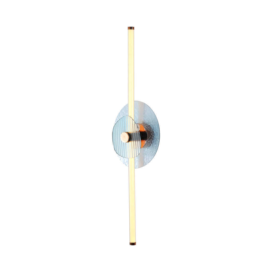 Bring modern elegance into your home with the Yep by Golden Lighting Colorella LED Wall Sconce. Featuring a glass shade and a rose gold frame, it creates a welcoming atmosphere. This sconce boasts a sophisticated hammered blue glass backplate and a reeded blue glass front plate, showcasing textures that beautifully interplay with light, creating a unique ambiance. Chic and luminous, the rose gold finish is the epitome of modern luxury, adding contemporary warmth and high-end style to your space. Perfect for enhancing hallways, stairways, and bathrooms, this damp-location-rated fixture is designed for covered and semi-enclosed spaces with occasional moisture. The sconce measures 12"W x 39.5"H x 5"D and features integrated LED technology, offering brilliant and energy-efficient illumination with 1440 rated lumens and a warm 3000K glow. Close your space with artistry and quality, making every moment a masterpiece.