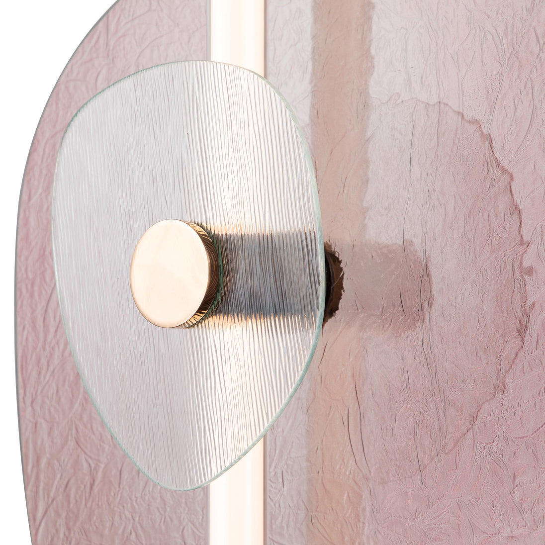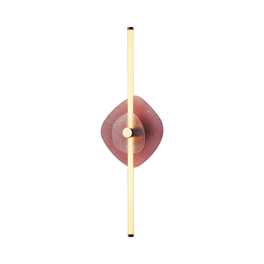 Bring modern elegance into your home with the Yep by Golden Lighting Colorella LED Wall Sconce in Rose Gold with Purple and Clear Glass. Featuring a glass shade, it creates a welcoming atmosphere in any room. The hammered blue glass backplate and clear ribbed glass front plate provide texture and sophistication, beautifully catching and dispersing light. The chic Rose Gold finish, created through a durable electroplating process, adds contemporary warmth and luxury. Suitable for covered and semi-enclosed spaces such as bathrooms and covered porches, this sconce enhances hallways, stairways, and bedrooms alike. The wall sconce measures 12"W x 39.5"H x 5"D and boasts integrated LED technology, providing 1440 lumens of warmth at a 3000K color temperature. Make a stylish statement with this high-quality, artisanal fixture that truly stands out.