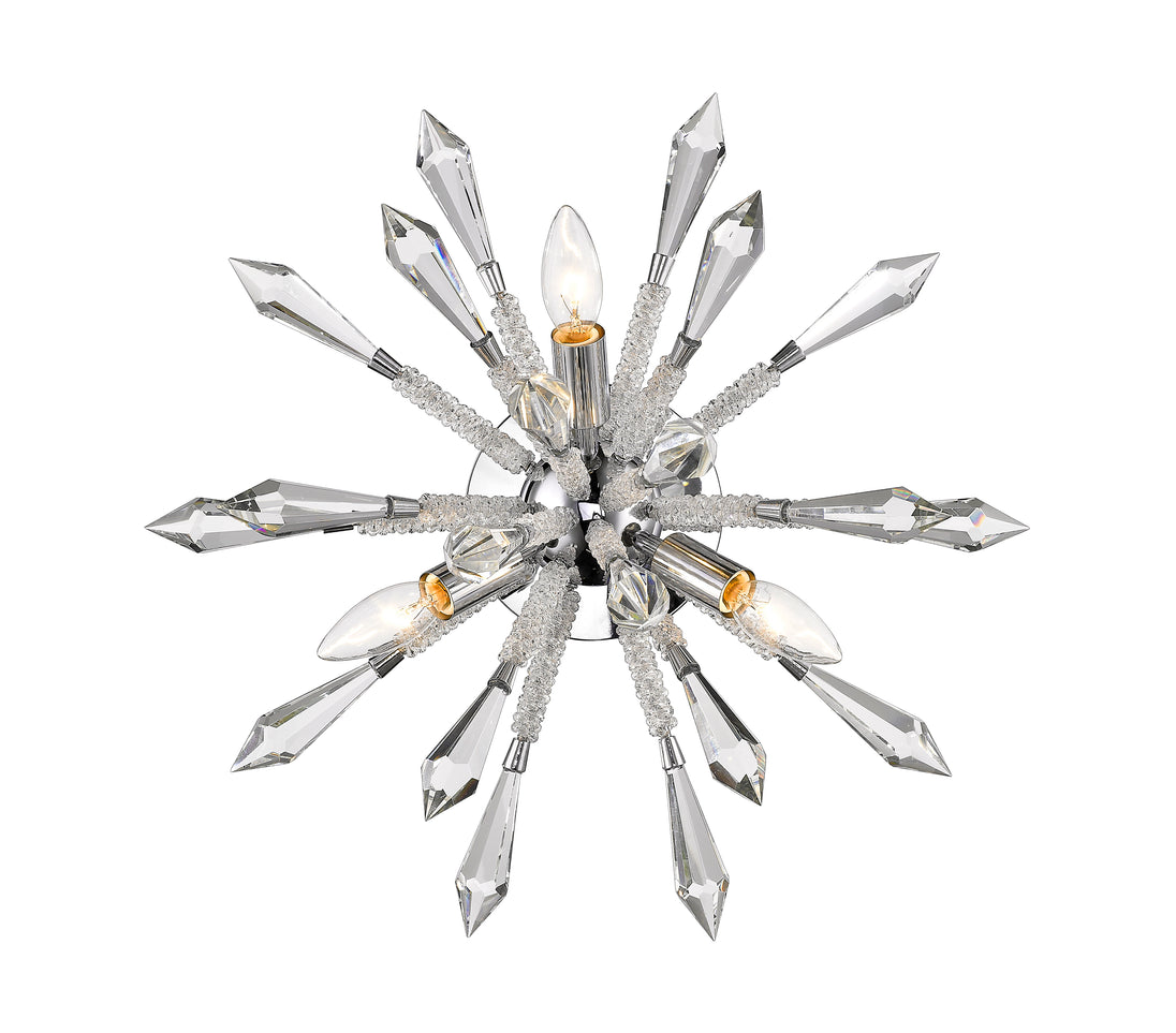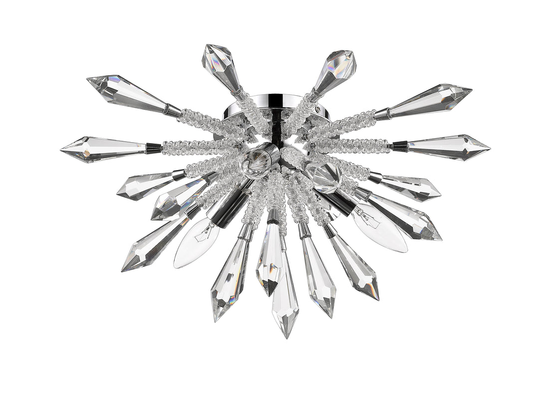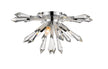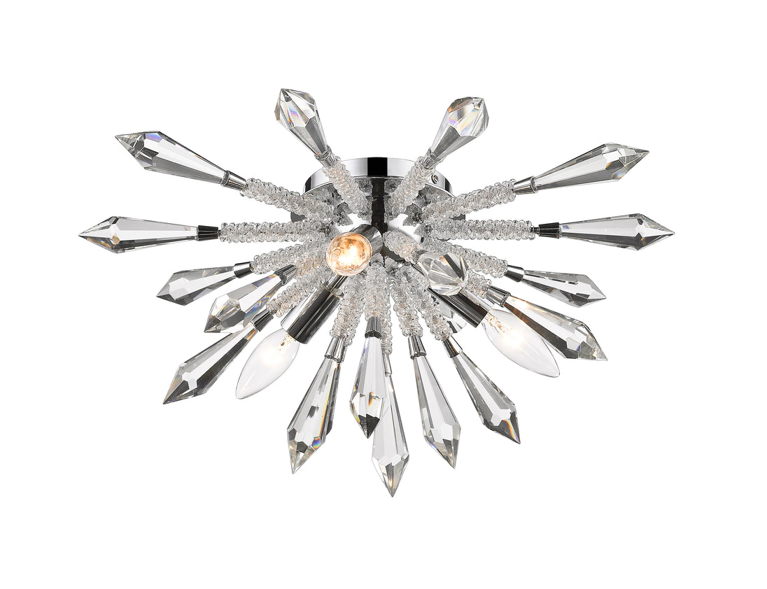 Add personality and glamour to a low-ceiling space with the elegant design of this three-light flushmount fixture. Radiating stems of crystal and chrome finish iron extend from an iron mount, creating a dynamic fireworks-inspired silhouette that becomes a conversation-starter.