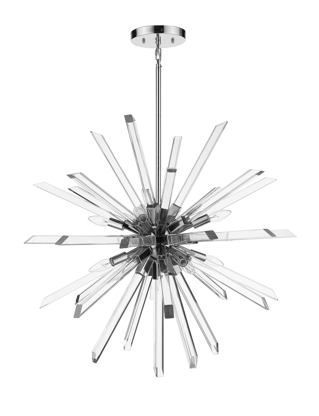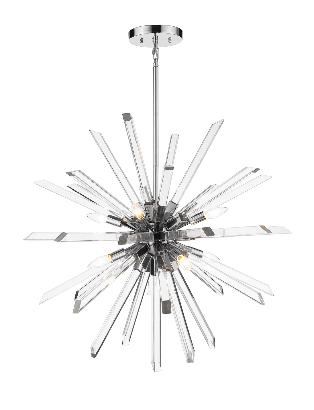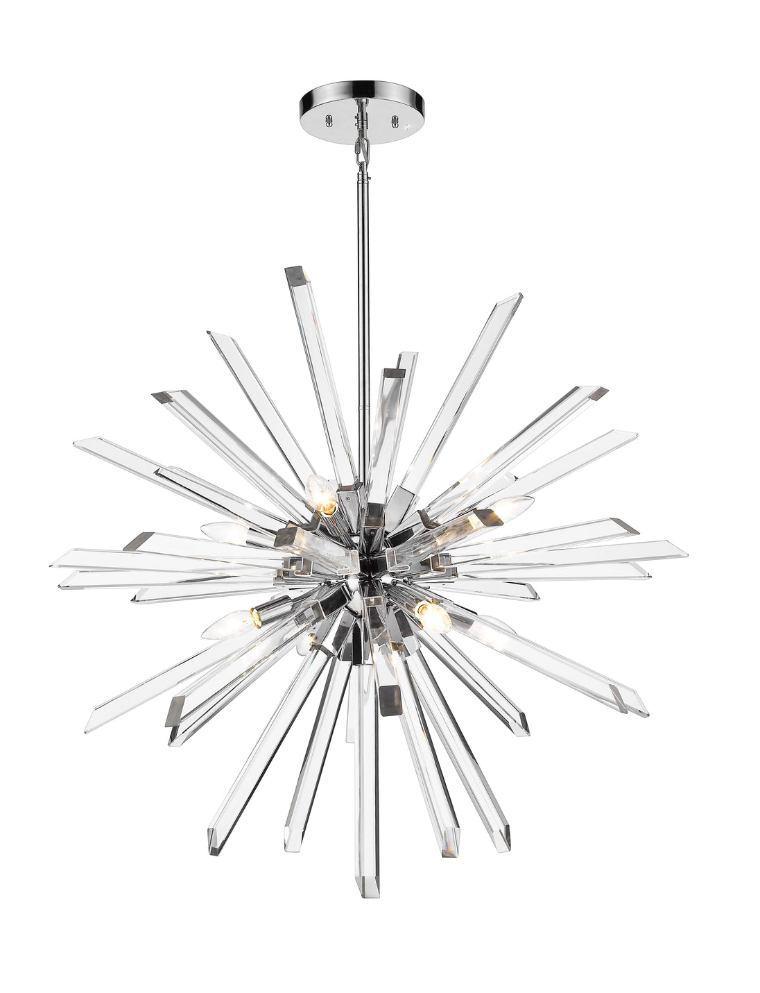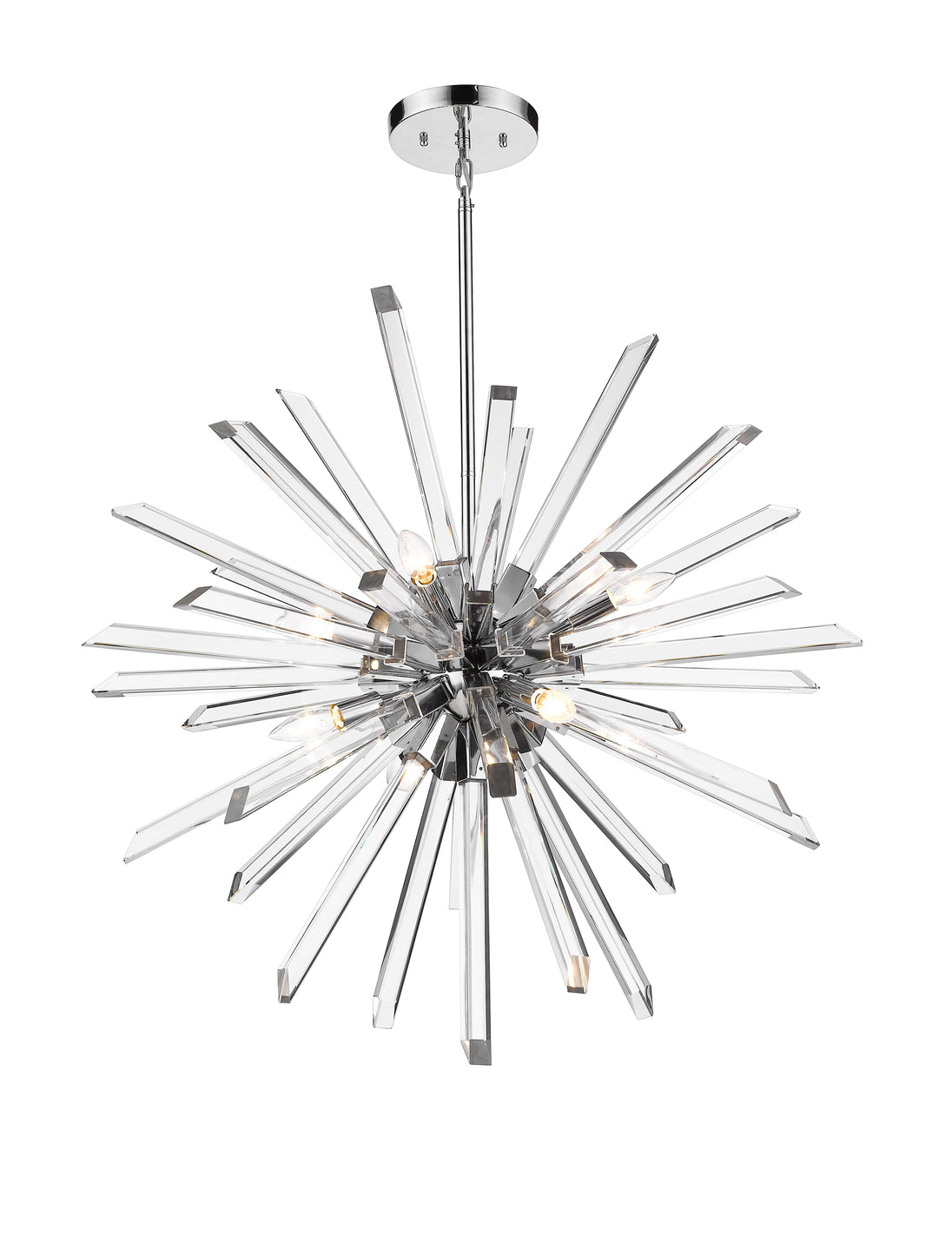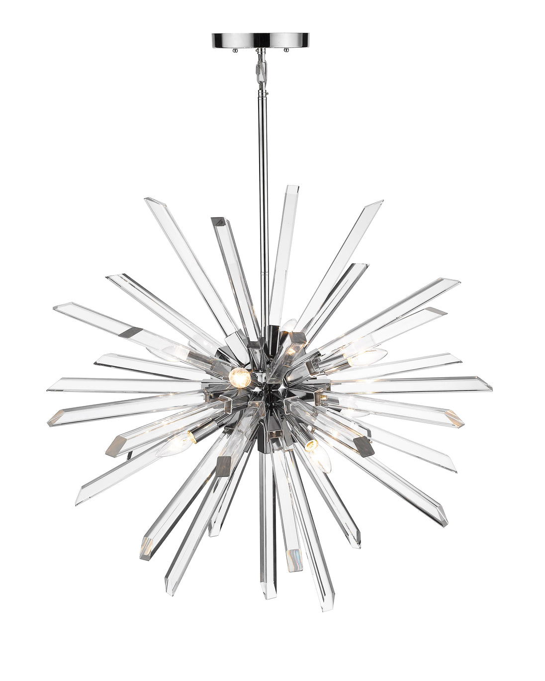 Long rods of glittering K5 crystal create a dimensional sunburst effect for this eight-light pendant. Complete with a straight suspension rod and a chrome accent finish, this dynamic design adds luxury and energy to a dining room or entry.