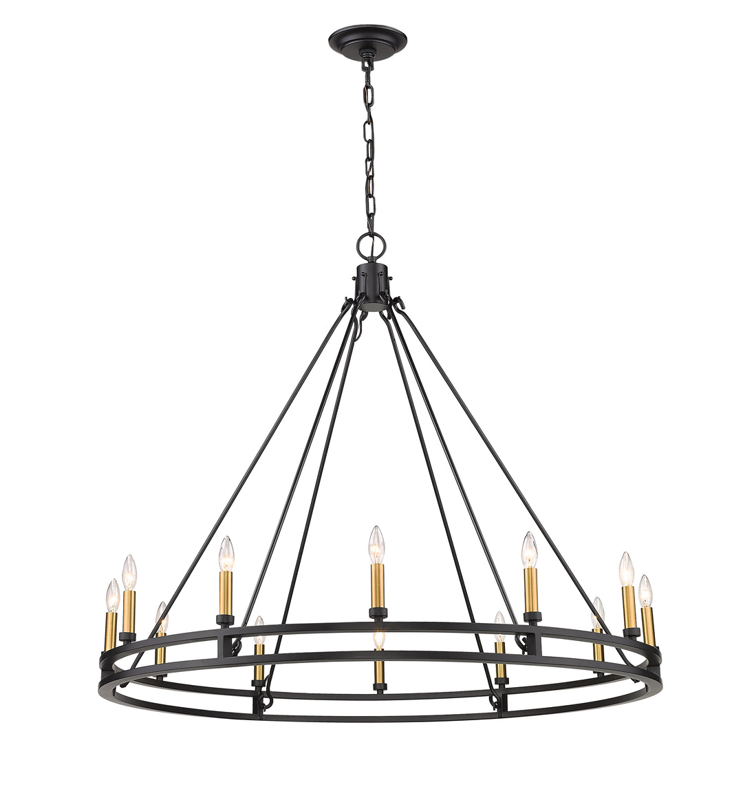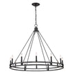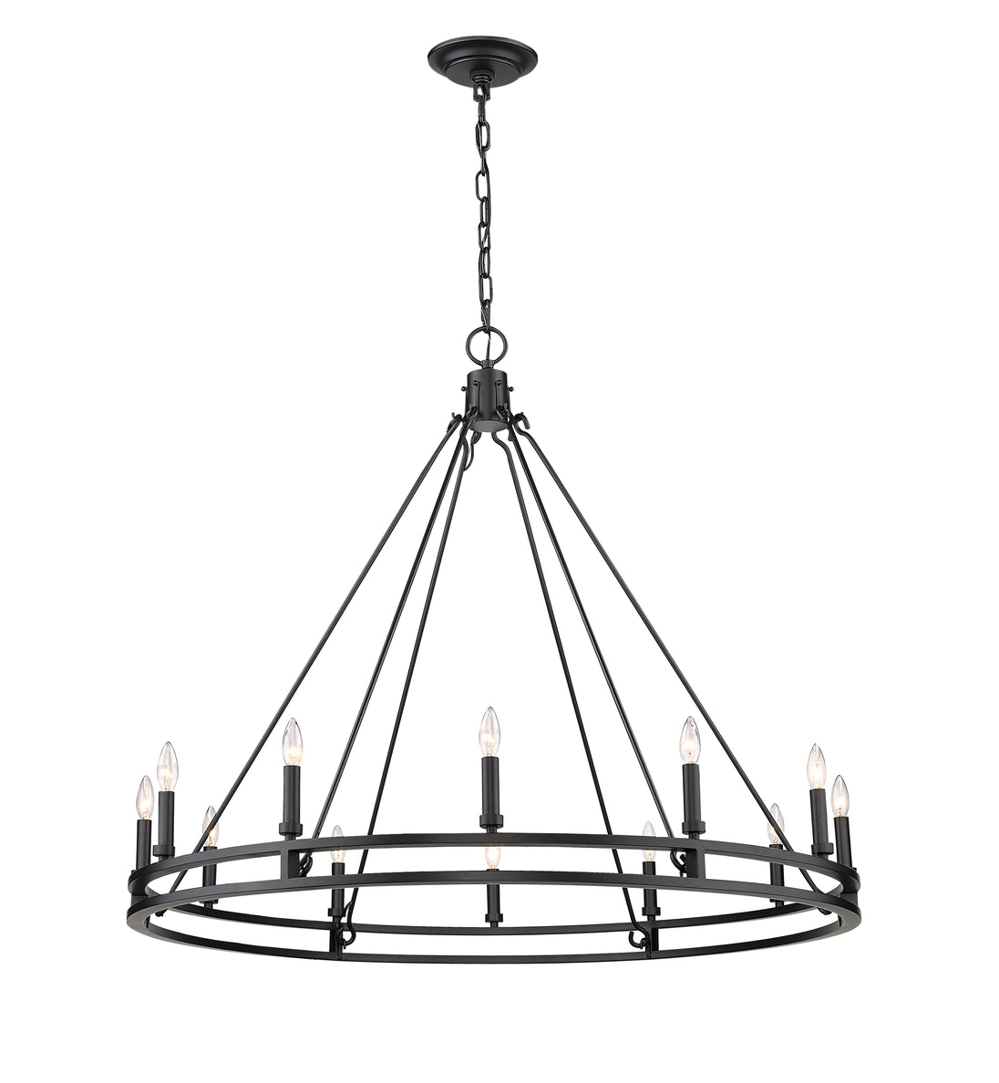 Palatial elegance offers a charming attitude that illuminates a classic custom space. This twelve-light chandelier adopts a dramatic aesthetic with geometric influence, and shows off a gorgeous Modern Matte Black metal ring frame dotted with candelabra bulb mounts.