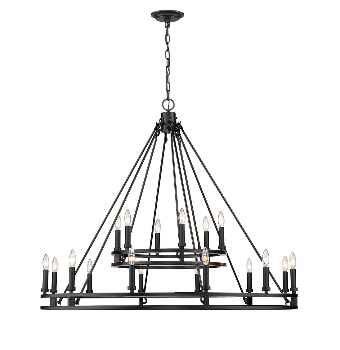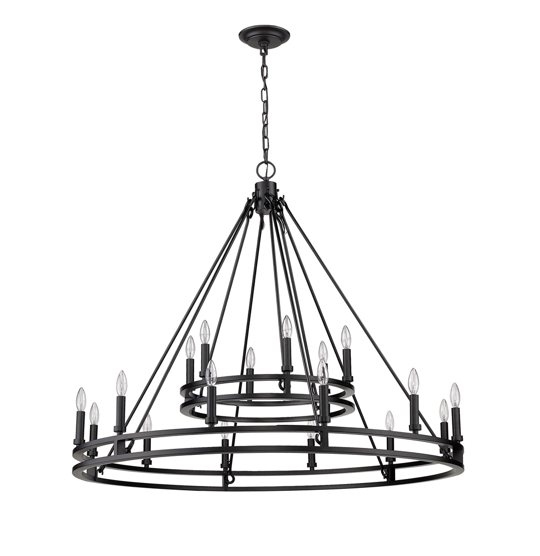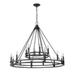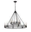 Palatial elegance offers a charming attitude that illuminates a classic custom space. This two-layer, eighteen-light chandelier adopts a dramatic aesthetic with geometric influence, becoming a focal point in a main living or dining area with its sleek Modern Matte Black finish metal ring frame.