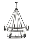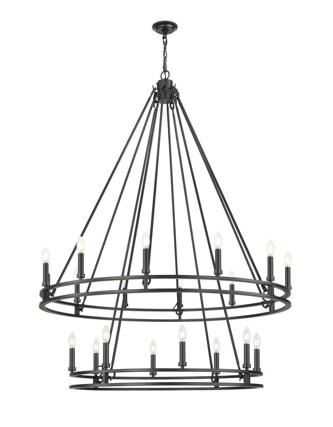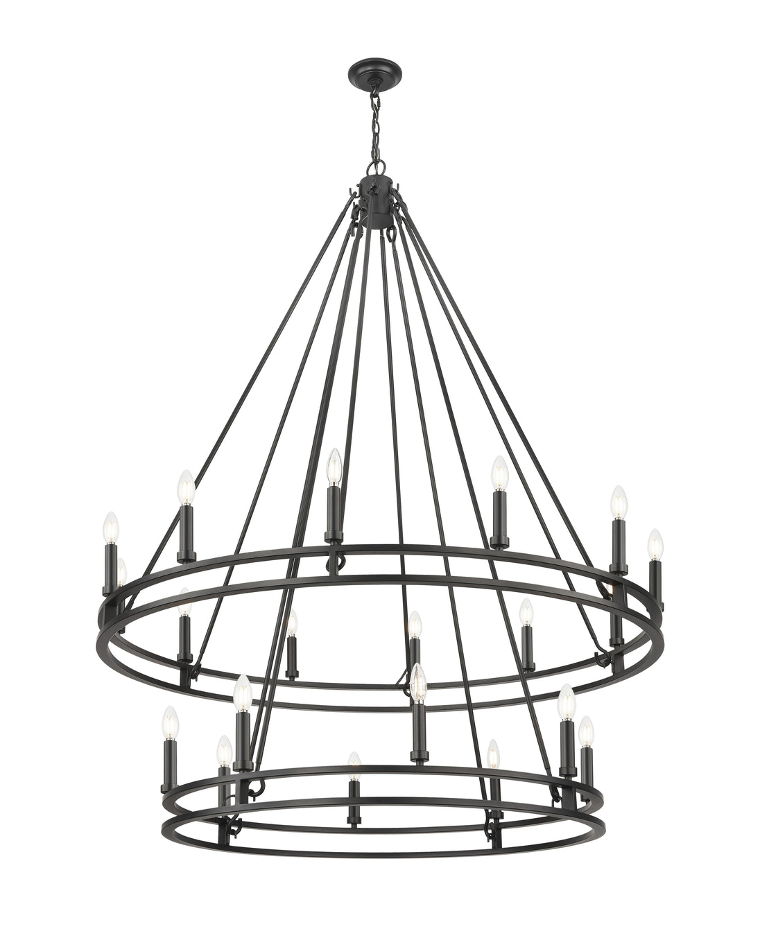 From coastal to contemporary to urban, this modern 20-light chandelier creates a bold centerpiece. Its two-tier silhouette features a larger ring above a smaller ring, each hosting candelabra lights to create a rich, warm glow over your foyer, stairwell, or high-ceilinged living space. A matte black finish is crisp and versatile, complementing virtually any interior decor.