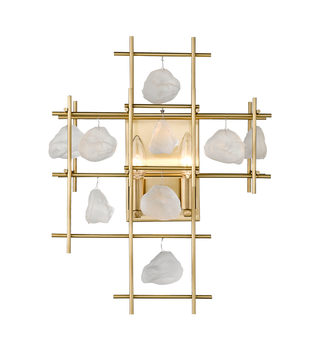 Garroway’s dramatic silhouette features interlocking bars in either a refined hand-rubbed brass or black matte finish. Crystal rocks are artfully suspended throughout a striking architectural grid. The Garroway comes in hand-rubbed brass with frosted crystal rock, or black with clear crystal rock. Available in two sizes. Sconce also available.