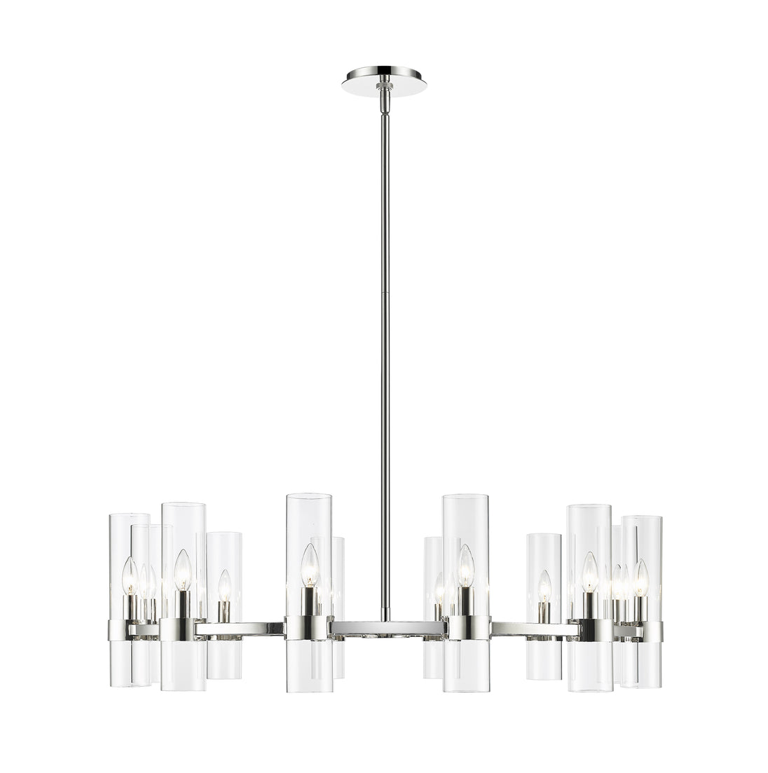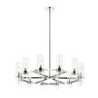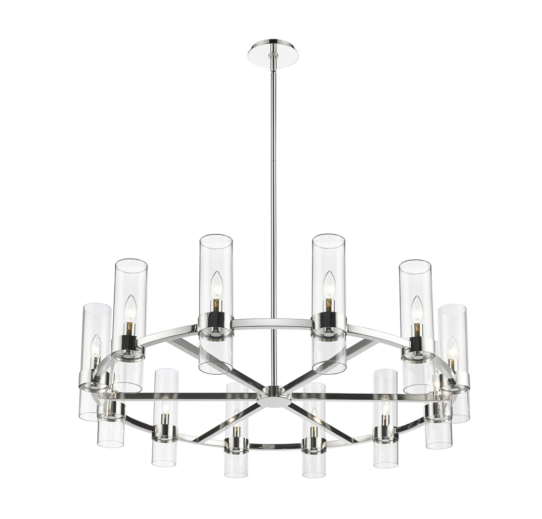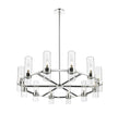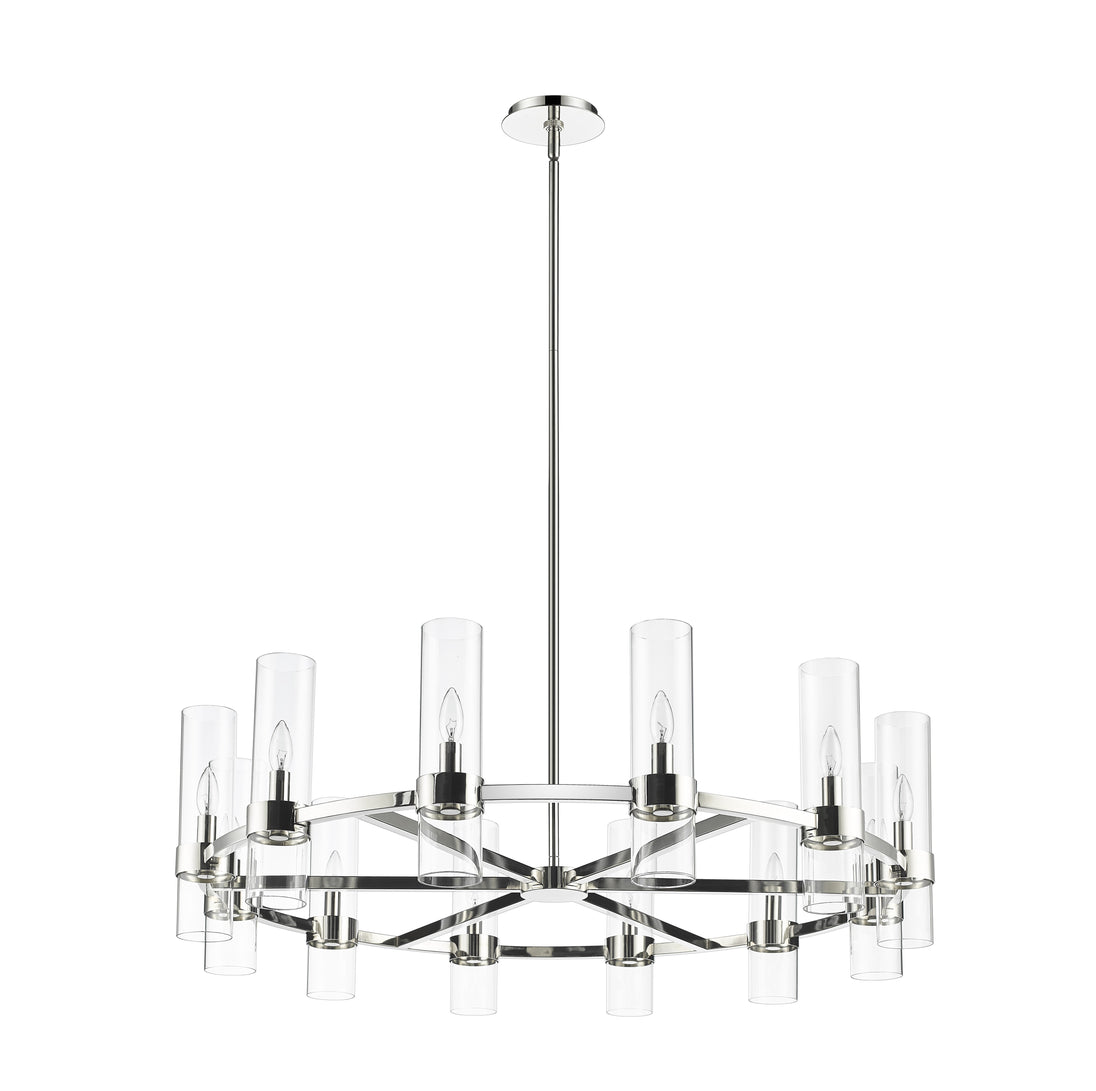 This contemporary twelve-light chandelier from the Datus collection features a slick round silhouette and a sense of simple elegance. Illuminate a foyer, dining area, or main living space with this circular-inspired chandelier featuring solid iron with a sleek polished nickel finish and delicate clear glass cylinders.