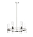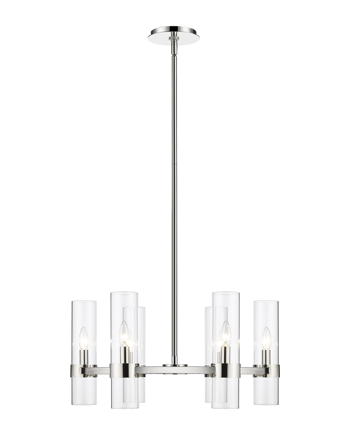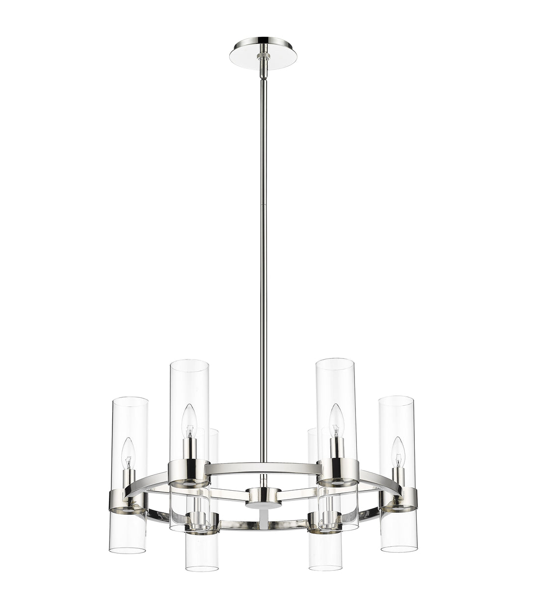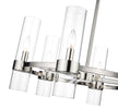 Take a minimalist approach to lighting a custom space, starting with the sophisticated design of this polished nickel iron and glass six-light chandelier. Perfect for a small- to mid-sized contemporary dining room, kitchen, or hallway, the Datus chandelier delivers chic style with a round frame crafted of polished nickel finish steel, dressed up with delicate clear glass cylinder shades.
