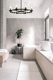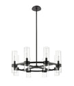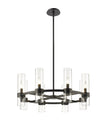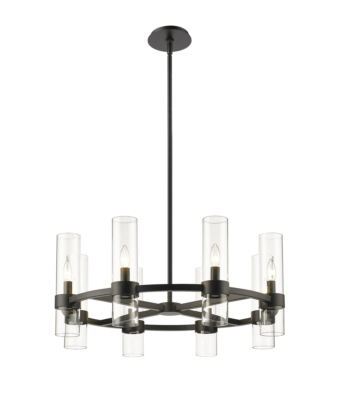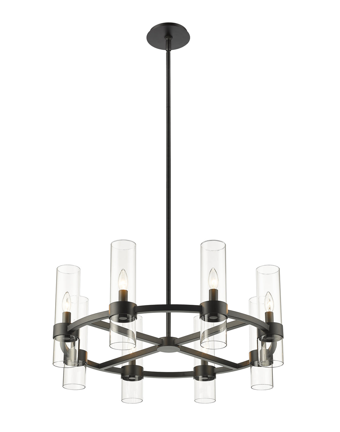 Distinctive modern style takes a page from industrial-inspired flavor, creating a captivating fixture blending matte black steel and glass. With a circular spoke-style frame, the Datus eight-light chandelier lends a minimalist approach to lighting with enough glam to stand out. Perfect for a small- to mid-sized contemporary dining room, kitchen, or hallway, this chandelier delivers drama with a round frame crafted of bold matte black finish iron, dressed up with delicate clear glass cylinder shades.
