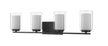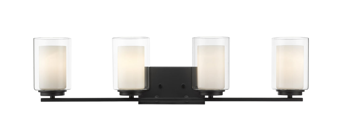 Give your powder room a chic, sophisticated update. This beautiful, matte black vanity light features four glowing bulbs beneath four delicate, glass shades that are matte opal on the inside and clear on the outside. An exquisite lighting option to highlight your refined sense of style.