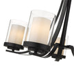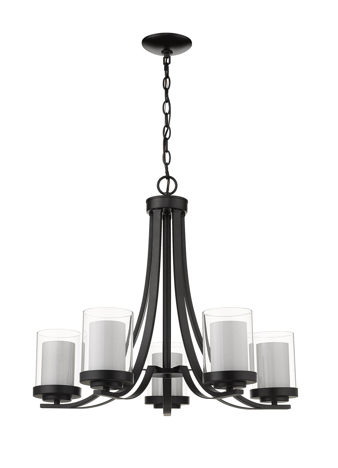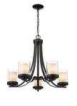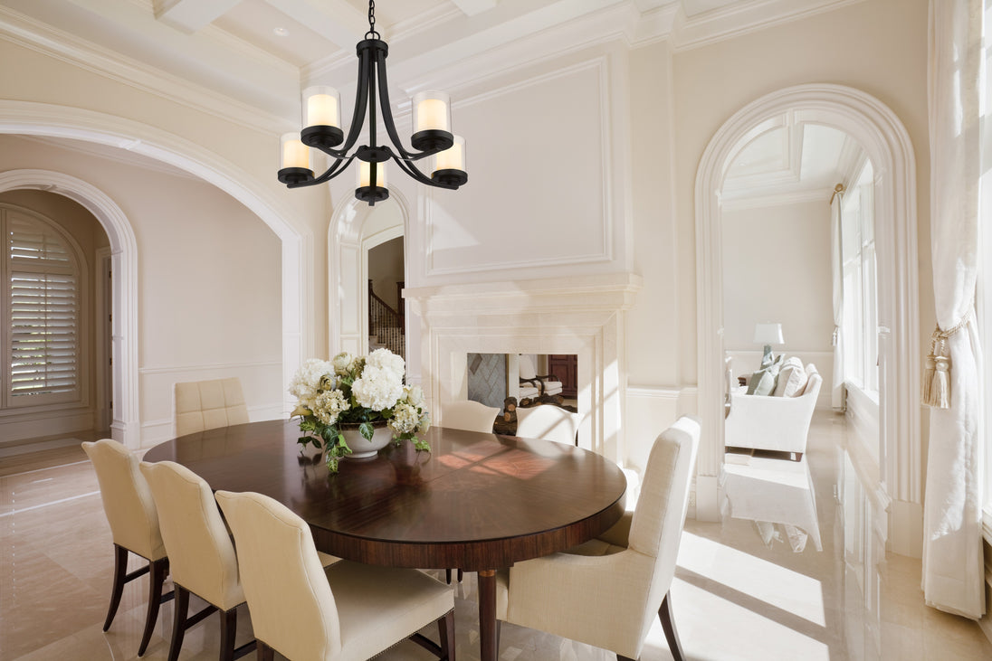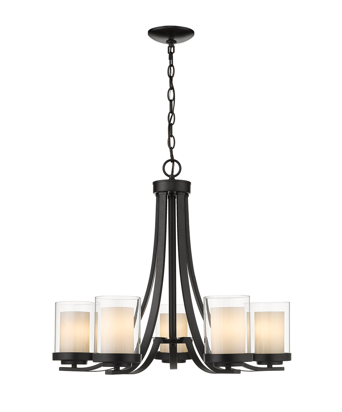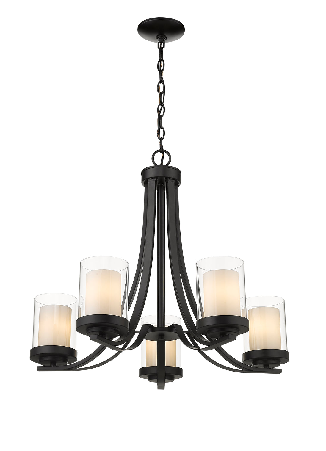 Give your dining room or great room a chic, sophisticated update. This beautiful, matte black chandelier features five glowing bulbs beneath five delicate, glass shades that are matte opal on the inside and clear on the outside. An exquisite lighting option to highlight your refined sense of style.