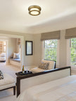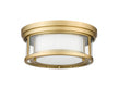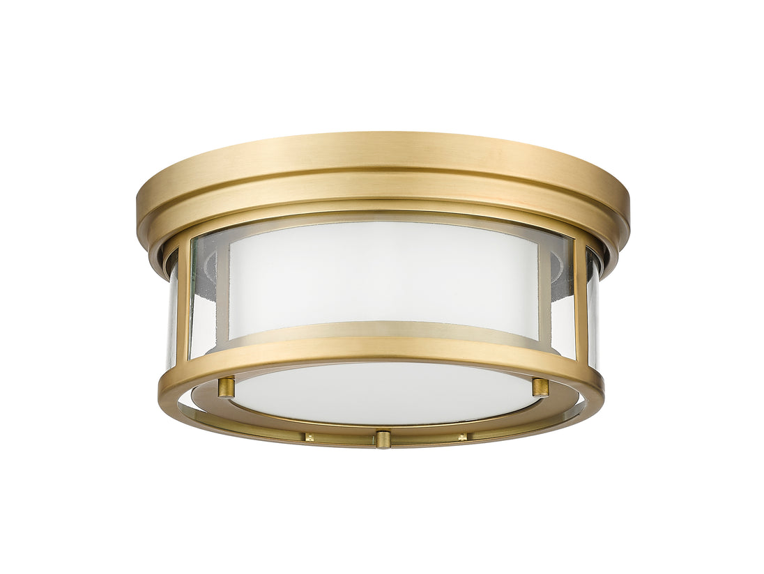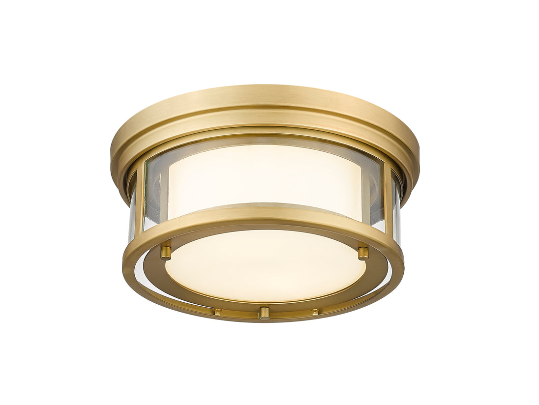 The Willow two-light flushmount ceiling light creates a statement in any space, offering minimalist styling with a hint of geometric flair. This ceiling light offers a romantic olde brass finish round steel frame with decorative arms. An inner matte opal shade is shielded by a clear outer glass shade to mix up the look and bring a tasteful ambiance to contemporary kitchens, hallways, and entryways.