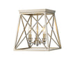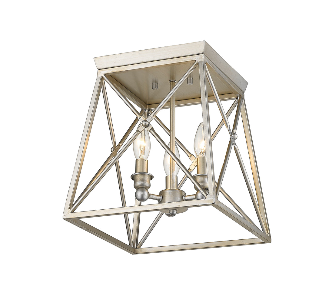 Indulge in an exercise of geometrics and stunning interior décor, adding this three-light flush mount ceiling light to a main living space. An open frame made from Antique Silver finish metal shelters a candelabra mount that softens its angular silhouette, mixing motifs and creating a compelling look.