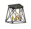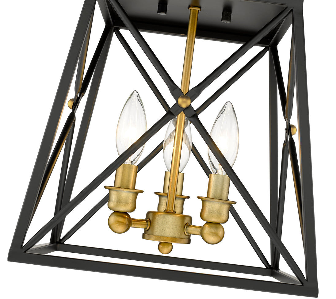 Indulge in an exercise of geometrics and stunning interior décor, adding this three-light flush mount ceiling light to a main living space. Bold Matte Black delivers a stunning finish to an angular metal frame with a lush Old Brass finish candelabra bulb mount.