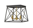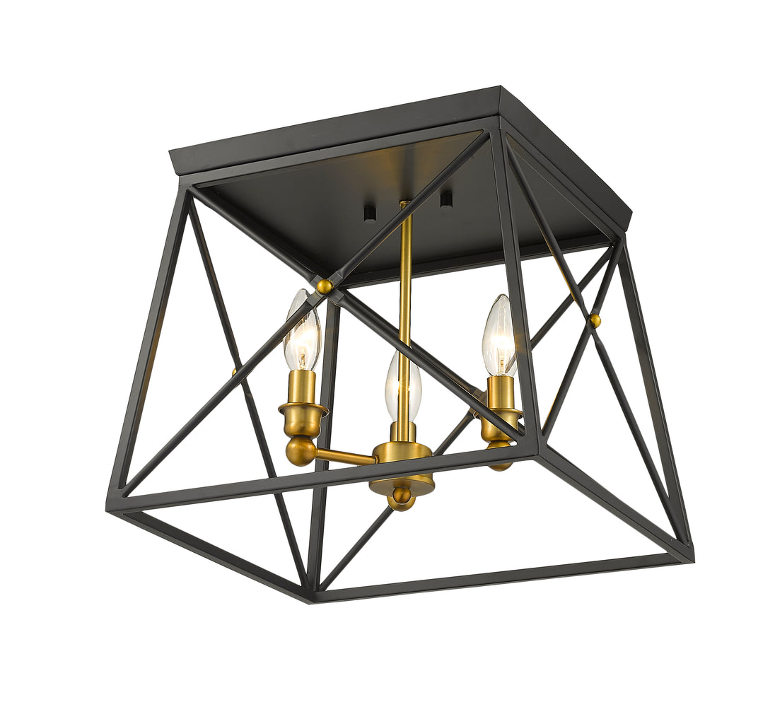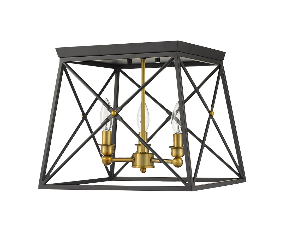 Indulge in an exercise of geometrics and stunning interior décor, adding this three-light flush mount ceiling light to a main living space. A dramatic contrast of Matte Black and rich Old Brass finishes combine in a metal cage shade and bulb mounts, delivering a provocative look for a transitional design motif.