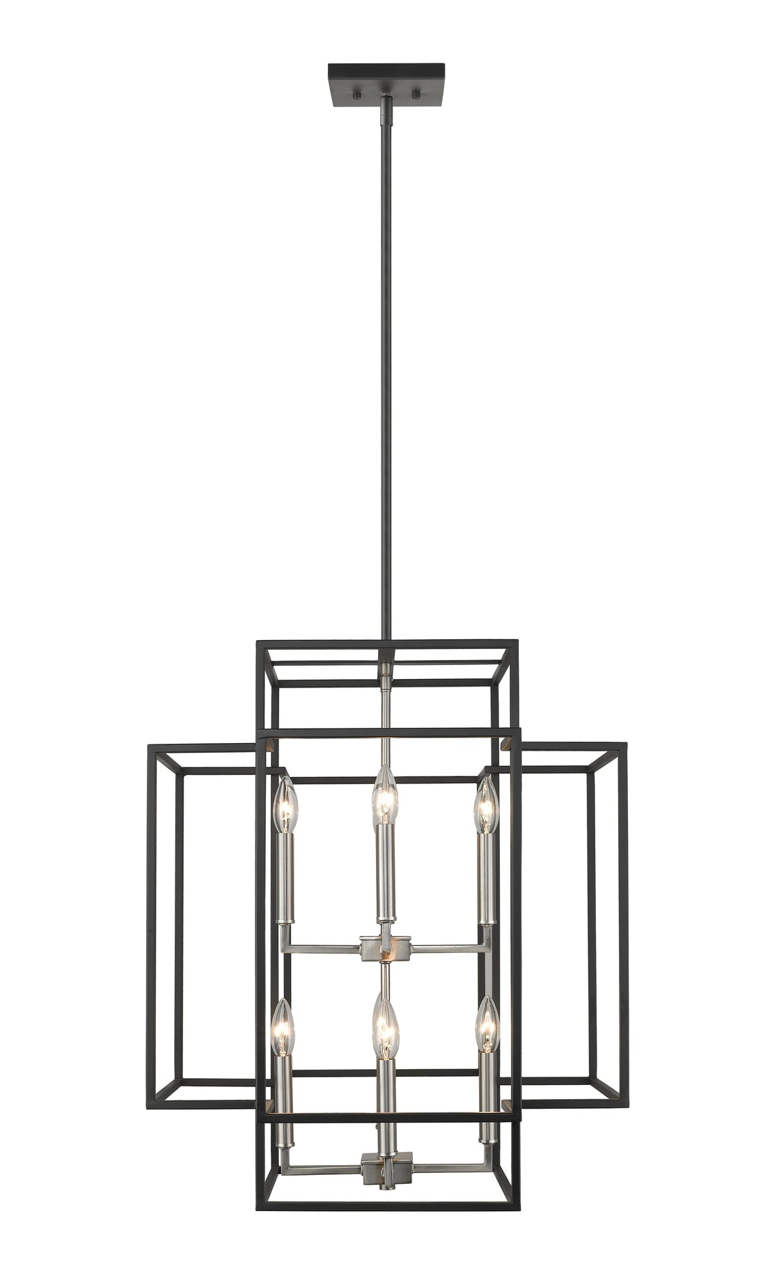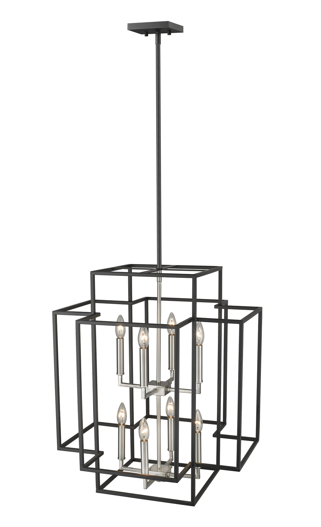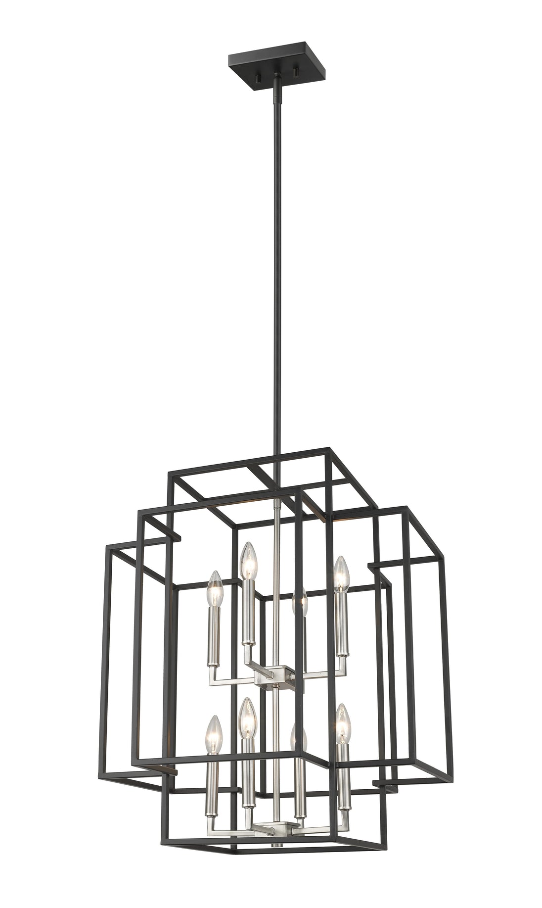 Dimensionality and open-concept design bring an enticing flavor to this black and brushed nickel steel eight-light pendant. With a commanding-yet-versatile presence, it delivers radiant illumination in a motif that blends crisp modern style with a soft romantic touch.