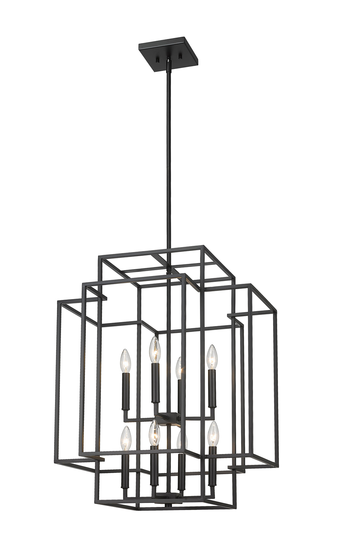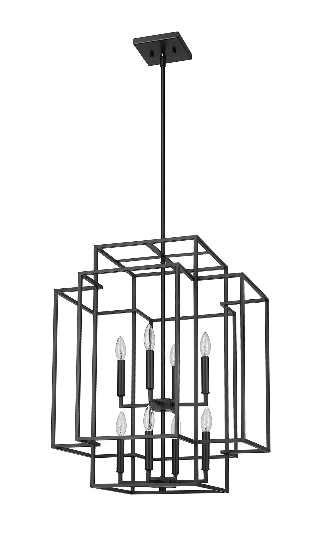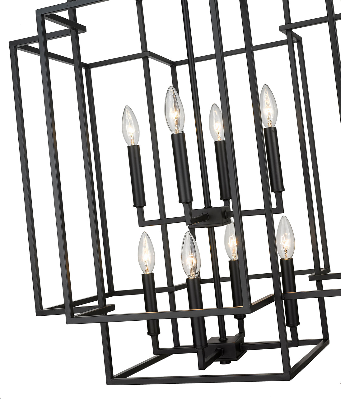An oversized steel cage offers a grand minimalist aesthetic to this contemporary eight-light pendant, designed with an elegant geometric tesseract-inspired shape. Modernizing spacious transitional interiors like a two-story entryway foyer or an open concept living room with high ceilings, this substantial transitional pendant boasts a stark matte black finish that presents a modern architectural feel and Frank Lloyd Wright-inspired aesthetic. This generous contemporary pendant shade offers a breathable design, showcasing eight candelabras topped with exposed bulbs, pushing the cleverly designed architectural mood.