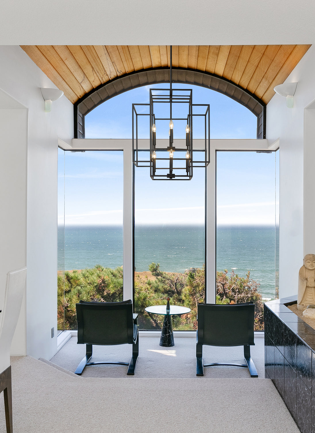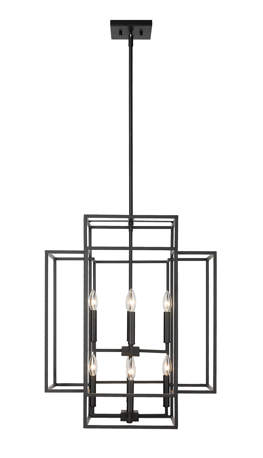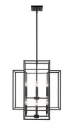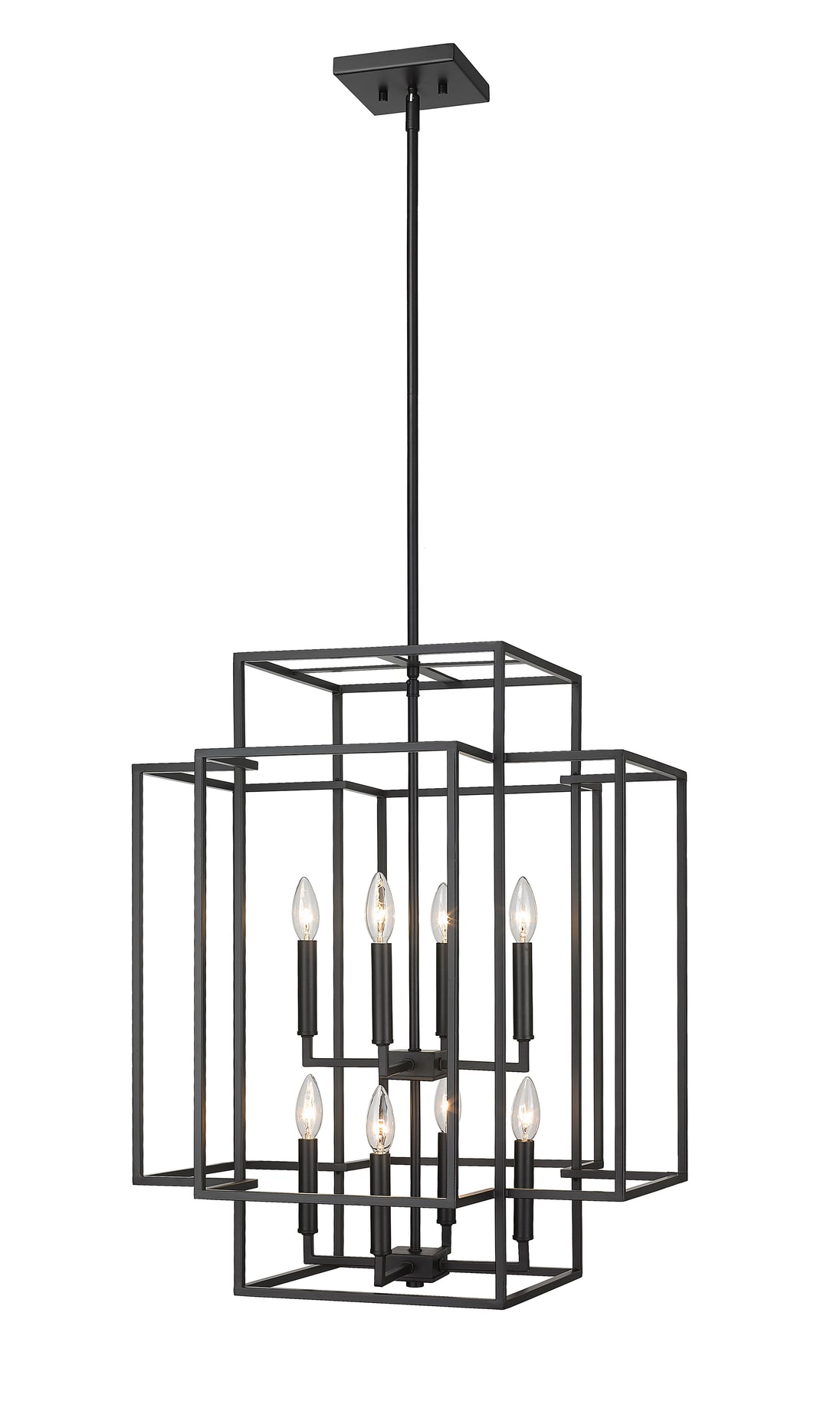 An oversized steel cage offers a grand minimalist aesthetic to this contemporary eight-light pendant, designed with an elegant geometric tesseract-inspired shape. Modernizing spacious transitional interiors like a two-story entryway foyer or an open concept living room with high ceilings, this substantial transitional pendant boasts a stark matte black finish that presents a modern architectural feel and Frank Lloyd Wright-inspired aesthetic. This generous contemporary pendant shade offers a breathable design, showcasing eight candelabras topped with exposed bulbs, pushing the cleverly designed architectural mood.