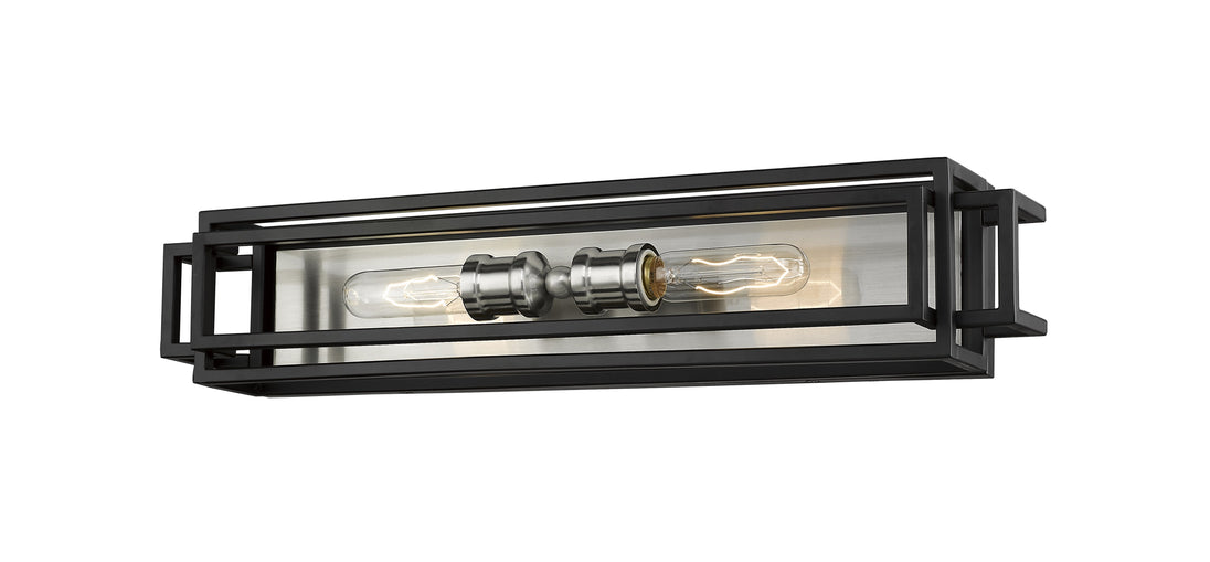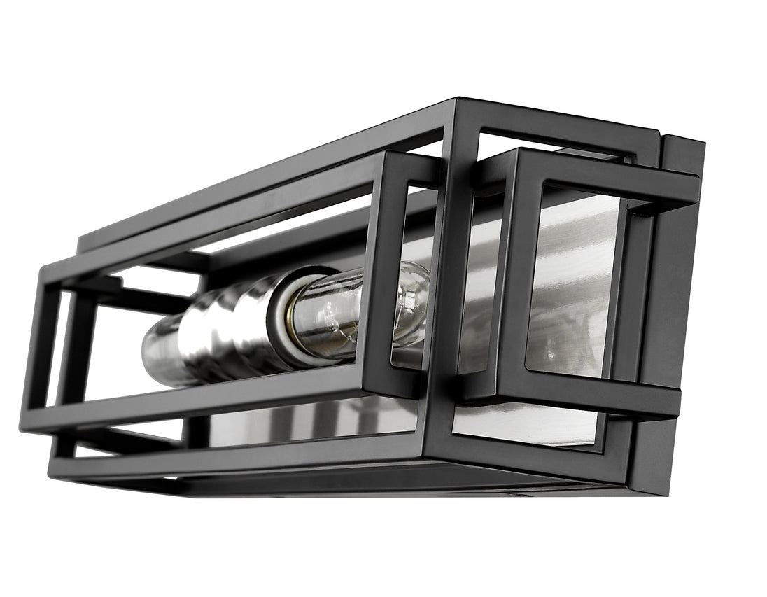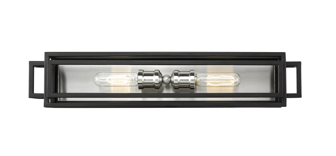 Exquisitely crafted with bold, black lines surrounding a gleaming, brushed nickel frame, this two-light vanity will illuminate your home in style. This handsome fixture looks especially elegant when placed over a bathroom mirror.
