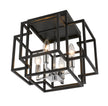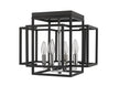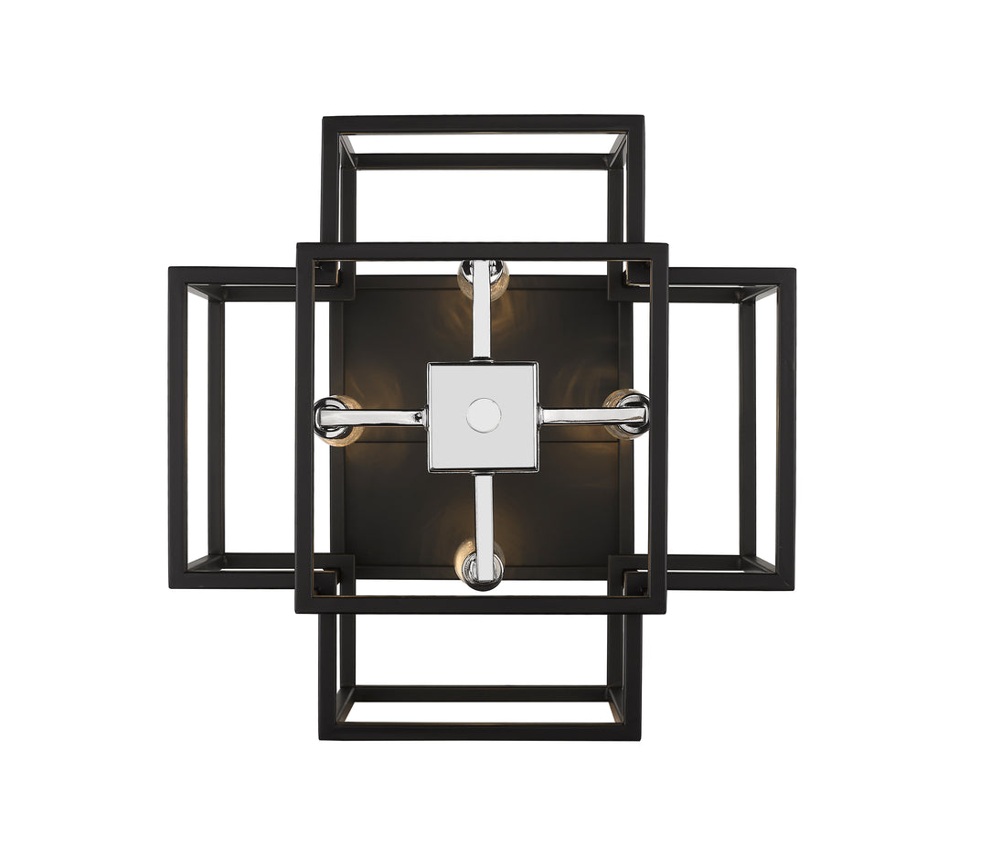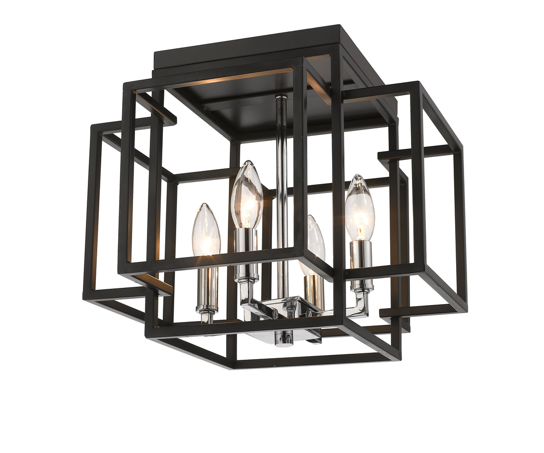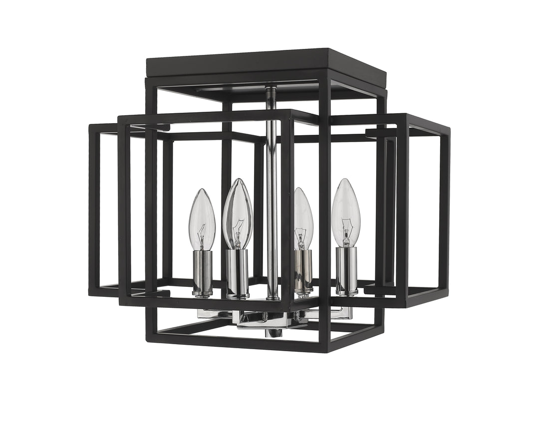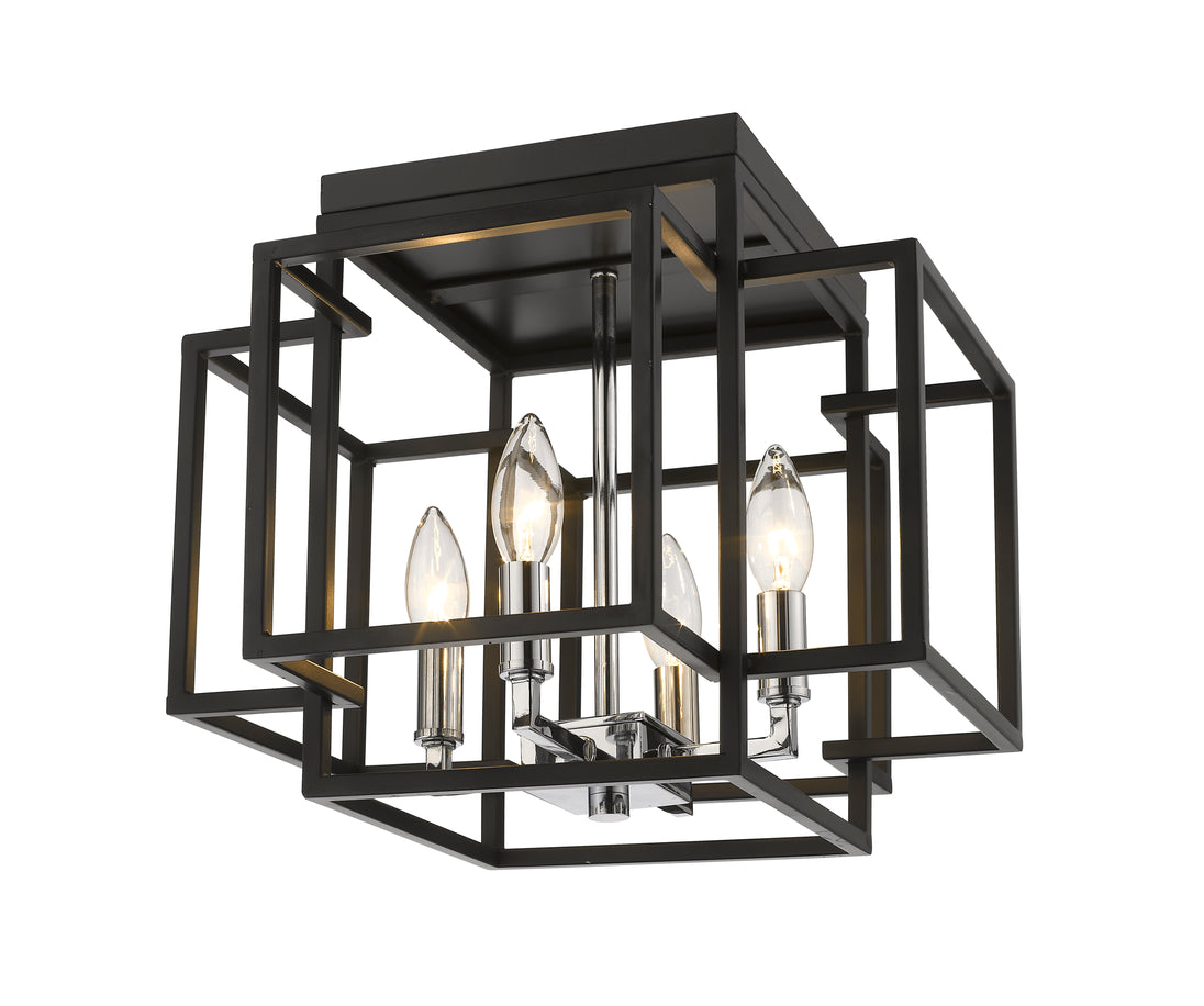 Contrasting finishes pad the extraordinary design of this four-light flush mount ceiling light. An architectural blend of rectangular shapes pairs a black steel frame with chrome finish bulb bases, and a surprisingly beautiful arrangement of candelabra-style bulbs that create a versatile contemporary and transitional dynamic.