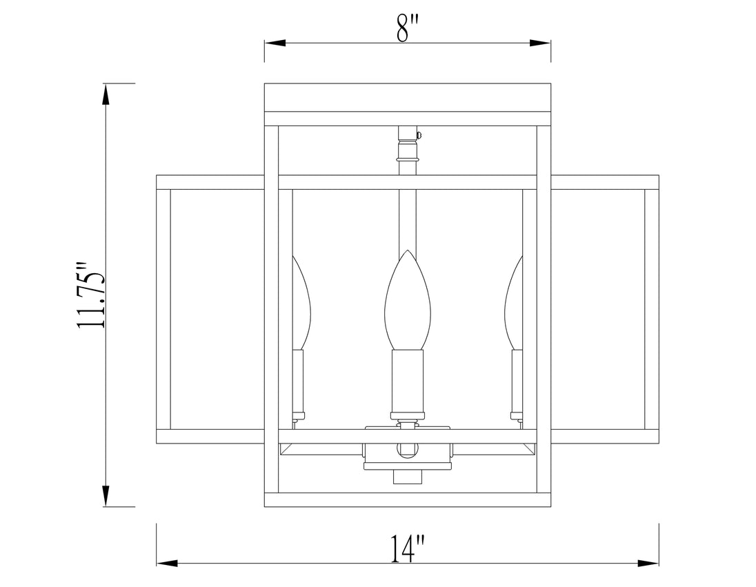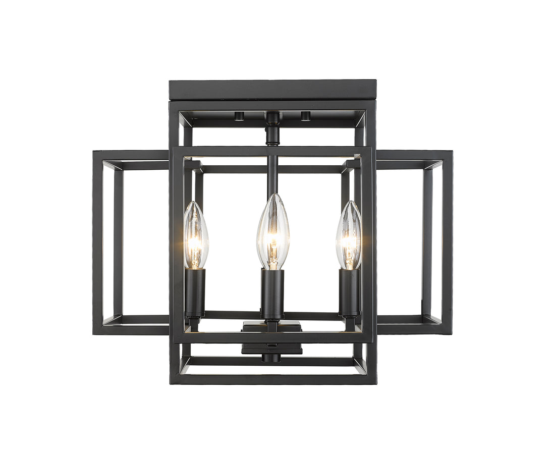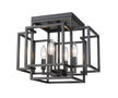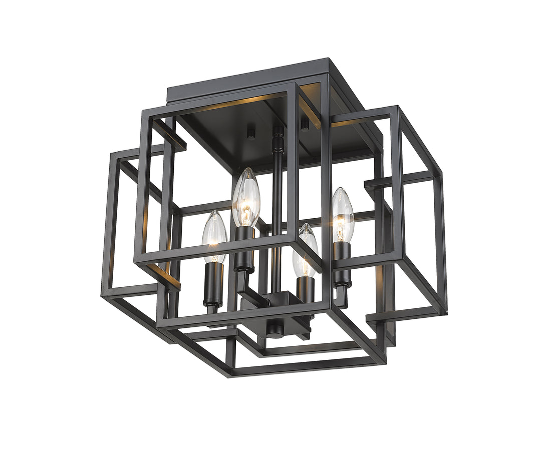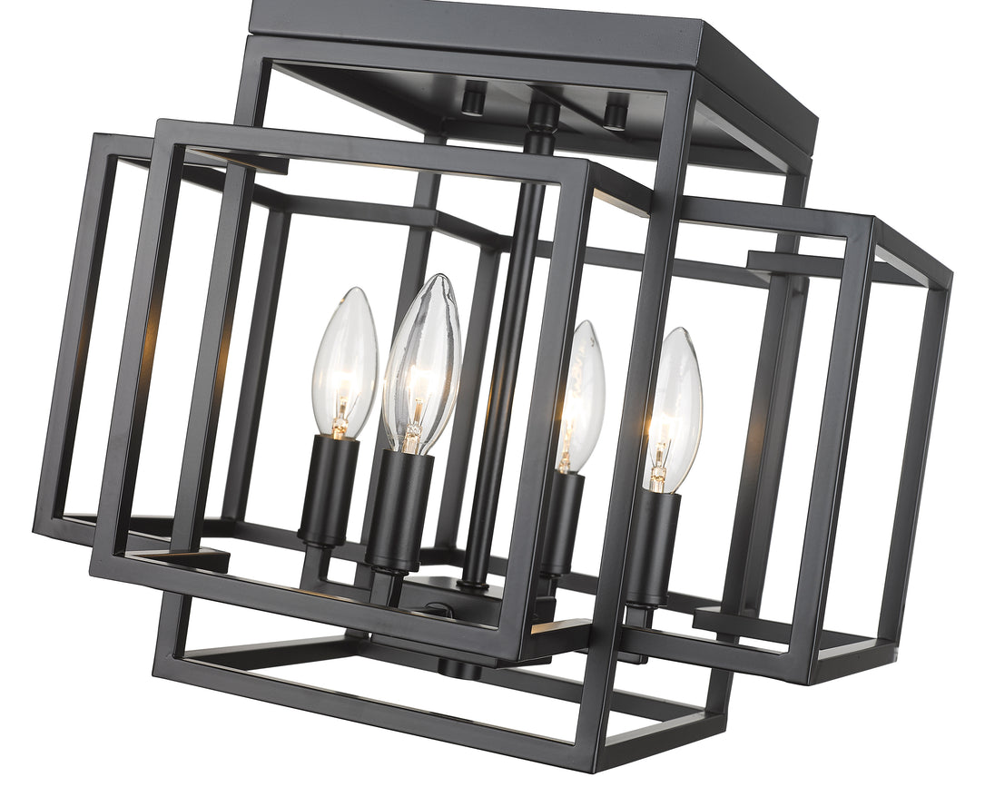 Illuminate a contemporary interior with this Arts and Crafts architecture-inspired modern flush mount, featuring a dimensional wire frame cage that surrounds a candelabra style light fixture with exposed bulbs. With a striking silhouette brought on by the bold matte black finish steel cage, this modern four-light flush mount makes a beautiful minimalist style addition to foyers, dining rooms and so much more, elevating the space with its tesseract-like angles and spatial presence. Adorn this transitional flush mount with glowing Edison style bulbs for a wonderfully inviting glow and ambiance.
