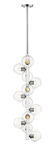This 12-light chrome and glass pendant offers modern brilliance and space-saving convenience. A blend of shiny chrome finish steel sets the stage for delicate clear glass open orb shades that line up in various directions.