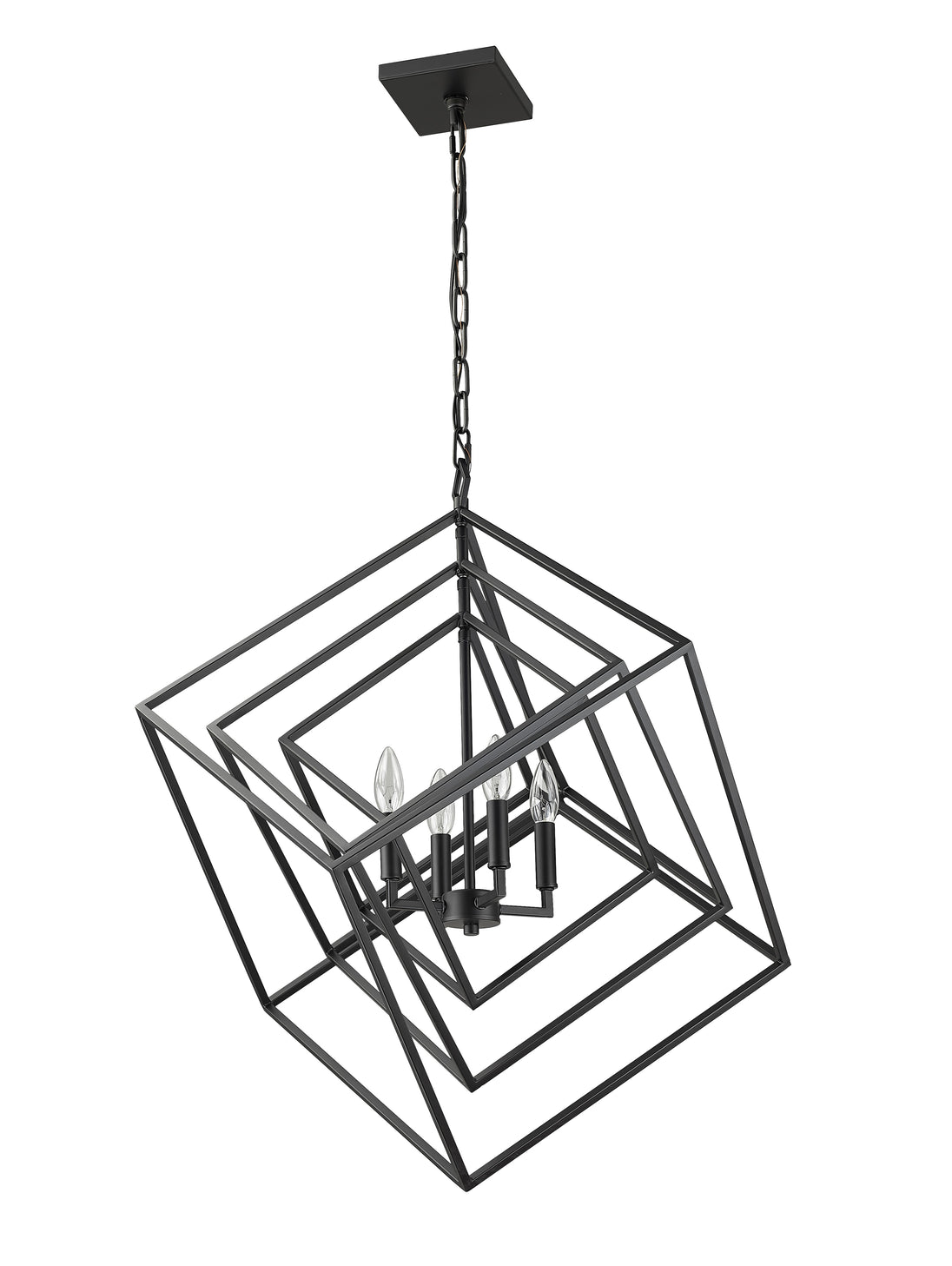 Clean lines and dramatic geometric patterns define this three-light chandelier in matte black. This contemporary design is crafted from steel with a matte black finish and features candelabra bulbs.