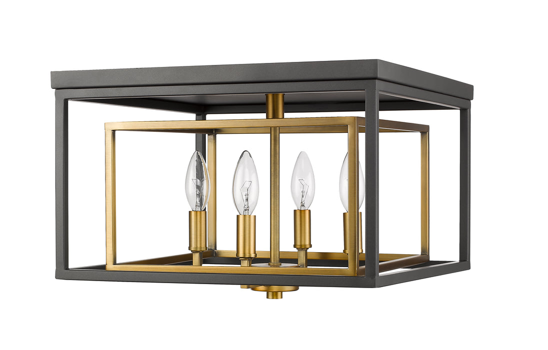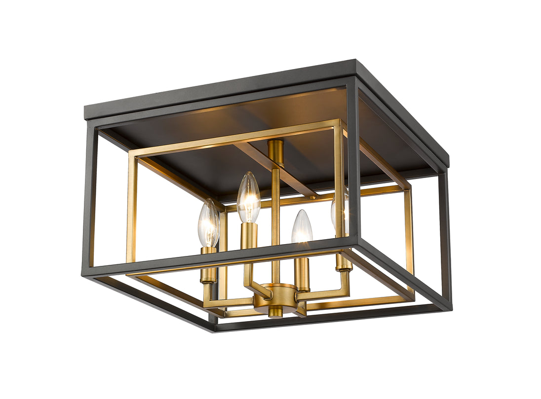 A steampunk inspired space gets a brilliant architectural twist with layered geometric cubes. Timeless olde brass and bronze finishes bring a feel of vintage inspiration in this four-light flush mount design.