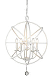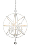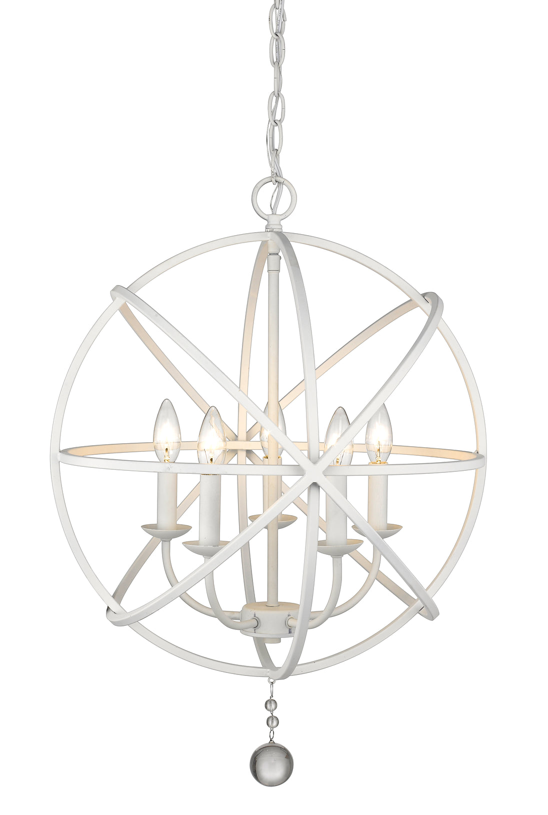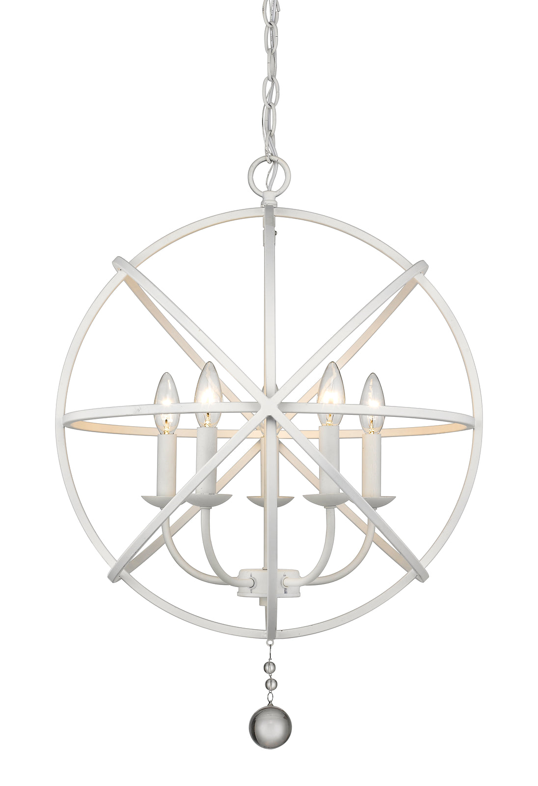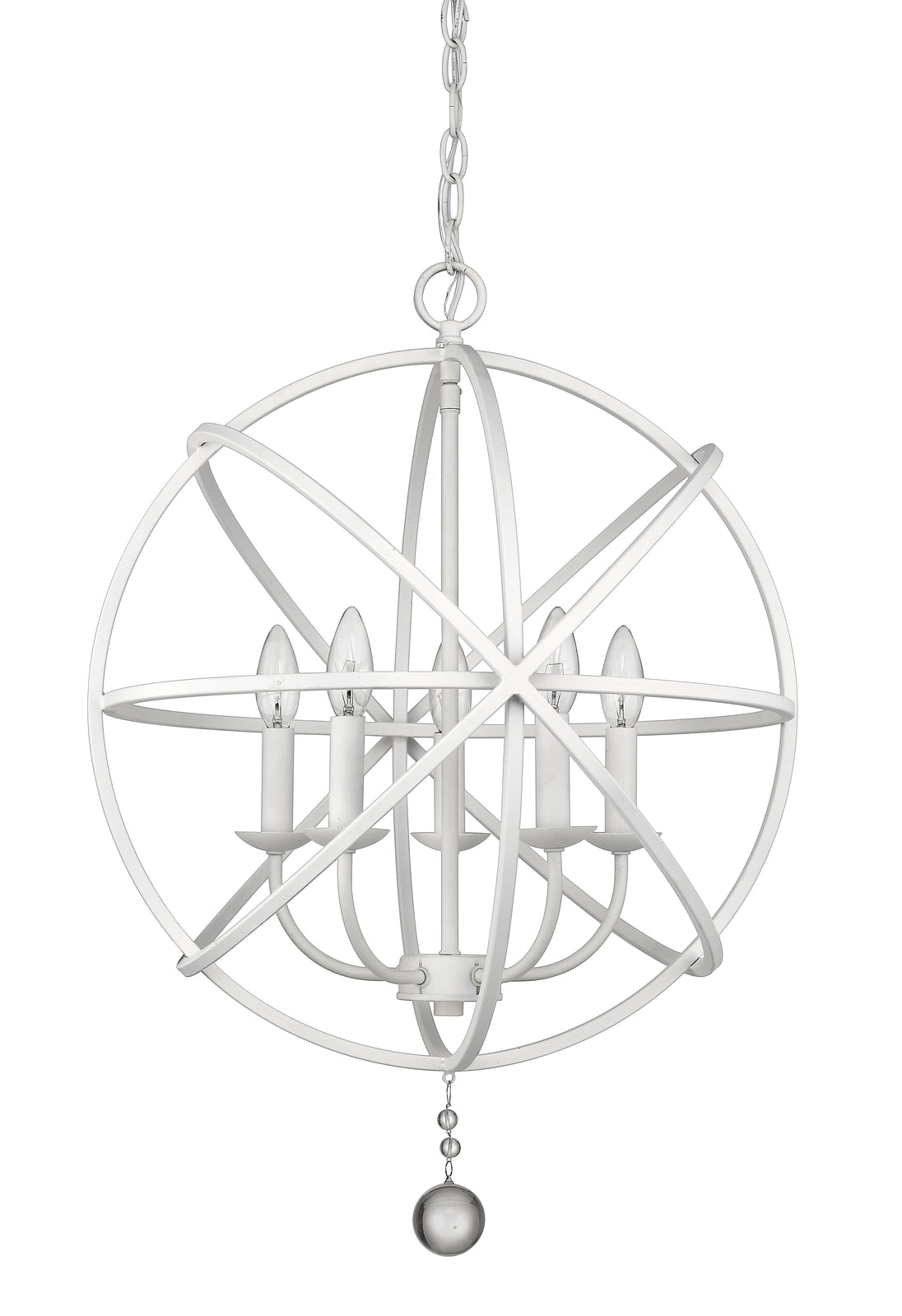 With a fresh matte white finish, the steel orb-shaped frame of this five-light chandelier comes to life and delivers an enticing design element radiating beautiful illumination. Make this fixture your own by customizing finishes on its frame interior, bulb bases, and finials, and enjoy the ornate bonus of floating crystal shapes that seal its exquisite aesthetic.