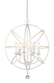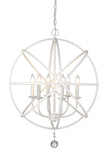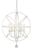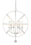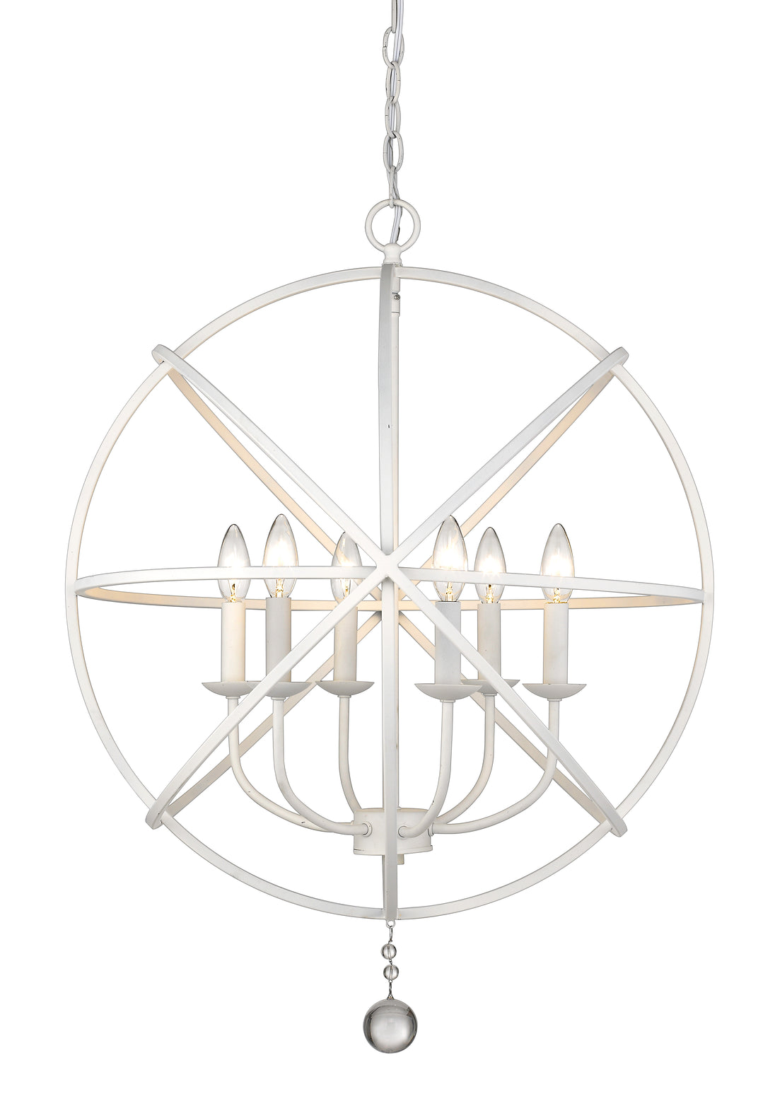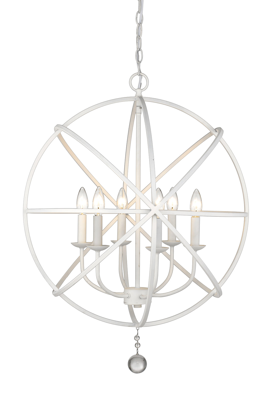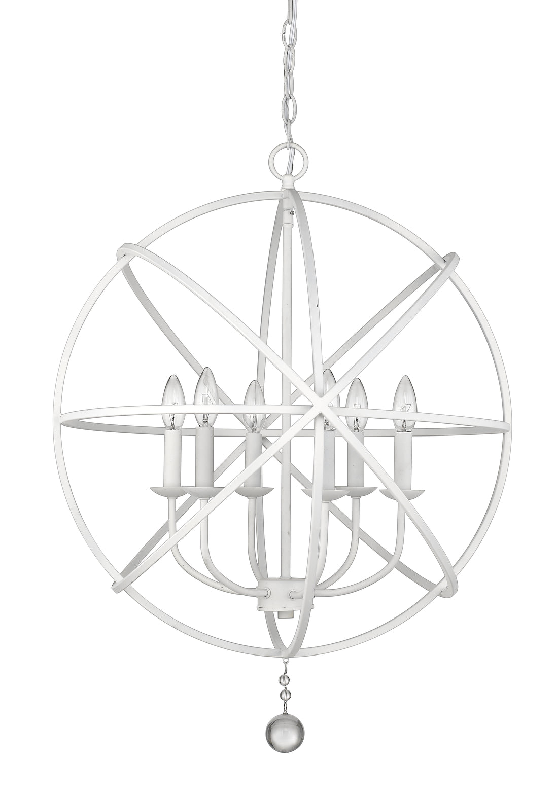 Attention-getting and freshly styled, this matte white six-light chandelier presents a fashionable mix of space-age modern style and charming traditional romance. Choose custom finishes to grace its interior frame, finials, and candelabra bulb bases, and enjoy the delicate look of dangling crystals that complete its design-forward look.