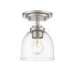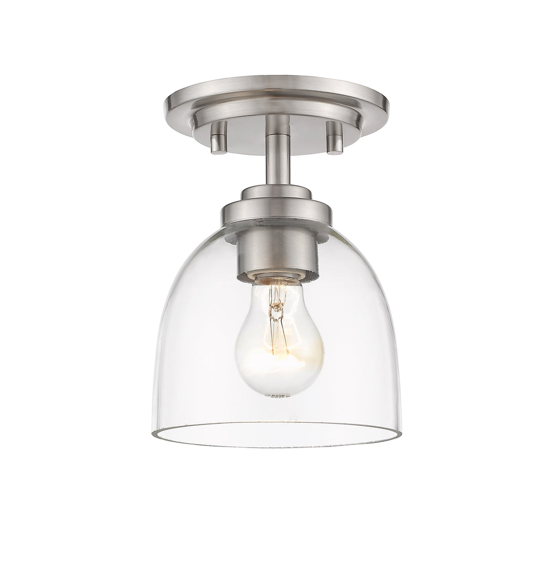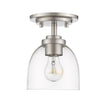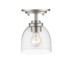 With lithesome curves, the sleek mount of this one-light flush mount embraces the flowing lines of the clear glass shade. A Hampton influenced style brings the beach inside with a brushed nickel finish.