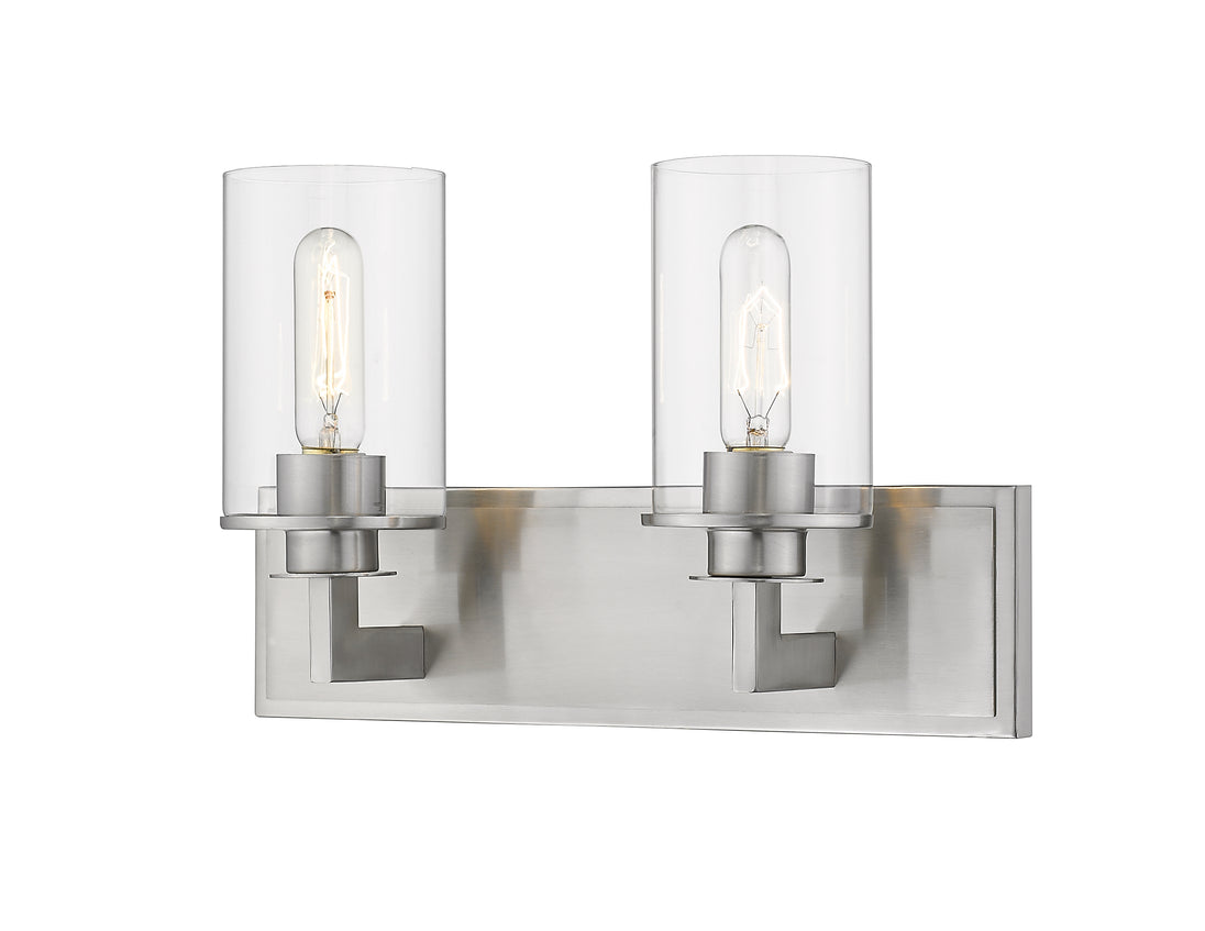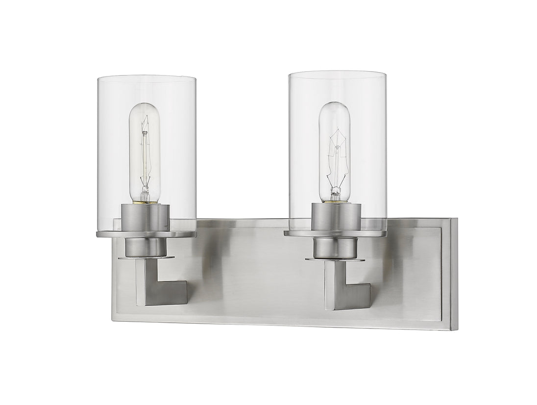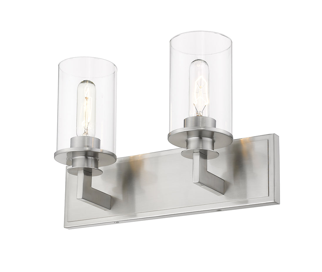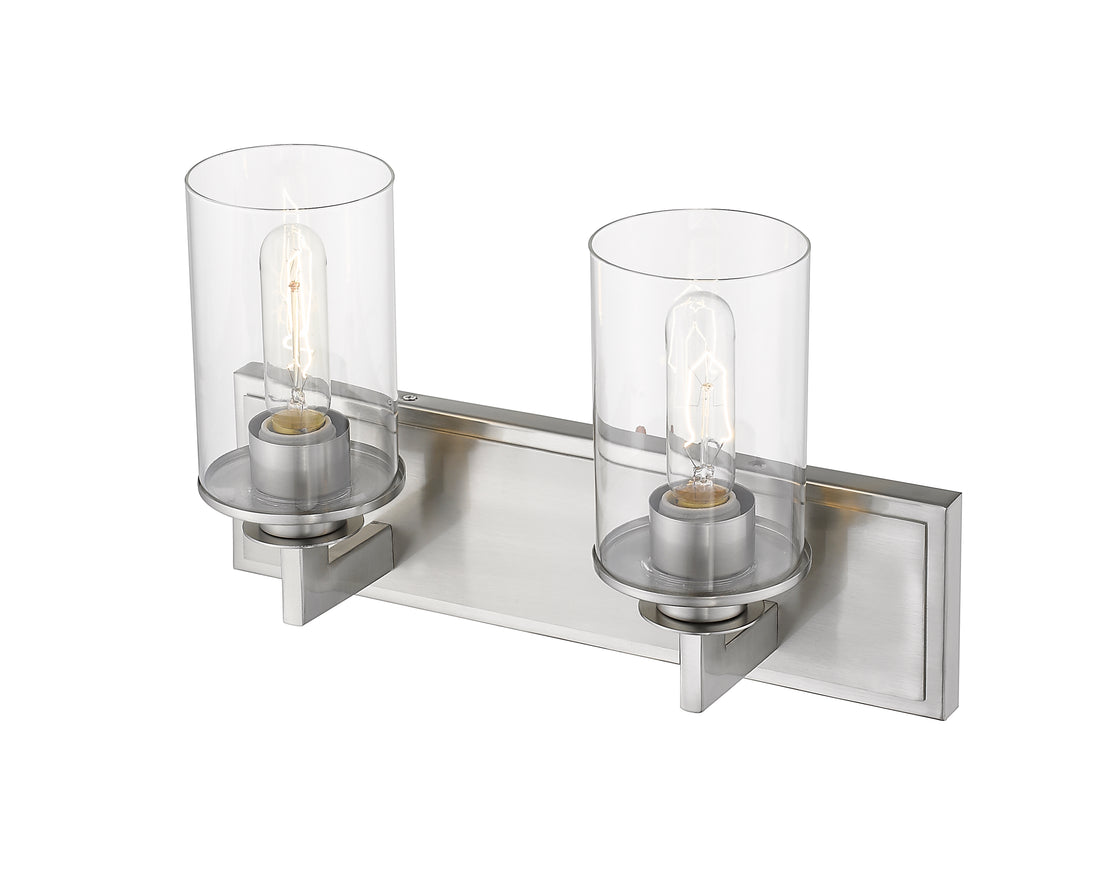 This mid-century modern two-light vanity exudes an elegant sophistication. A lux brushed nickel finish gleams against the brilliance of the clear glass cylinder shades.
