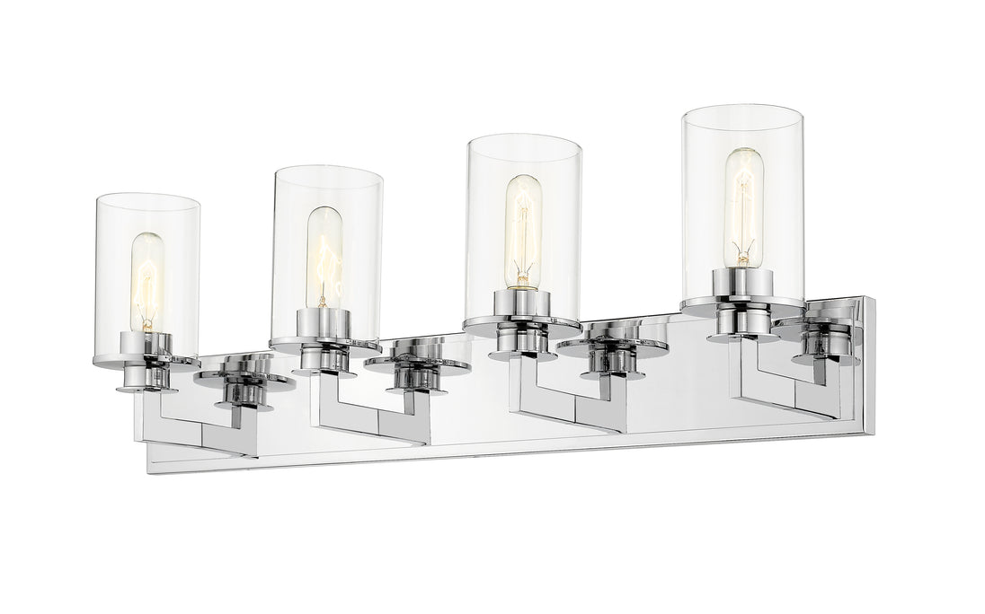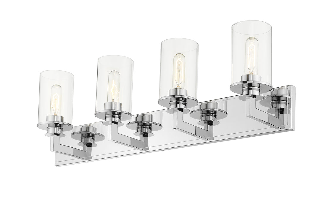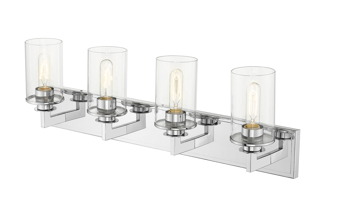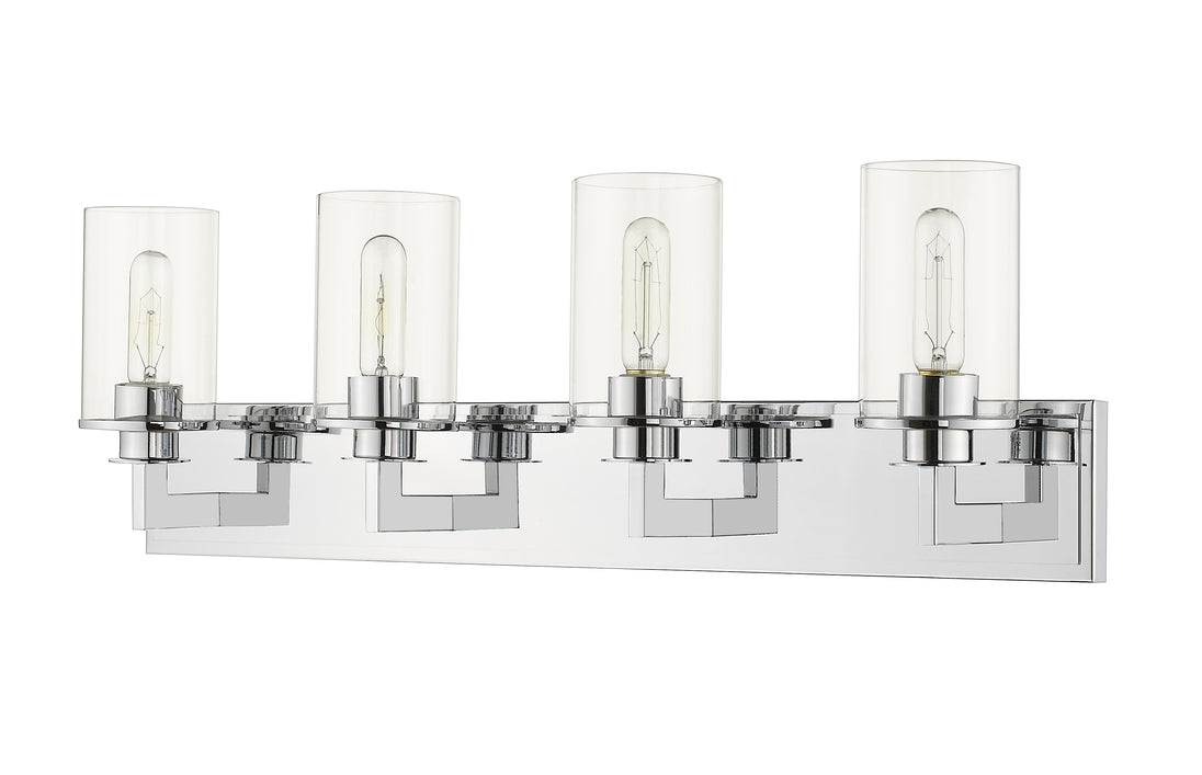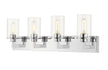 Bring a bold contemporary style to a modern bathroom with this mid-century modern four-light vanity. A stunning chrome finish underscores the luminous clear glass shades.