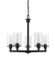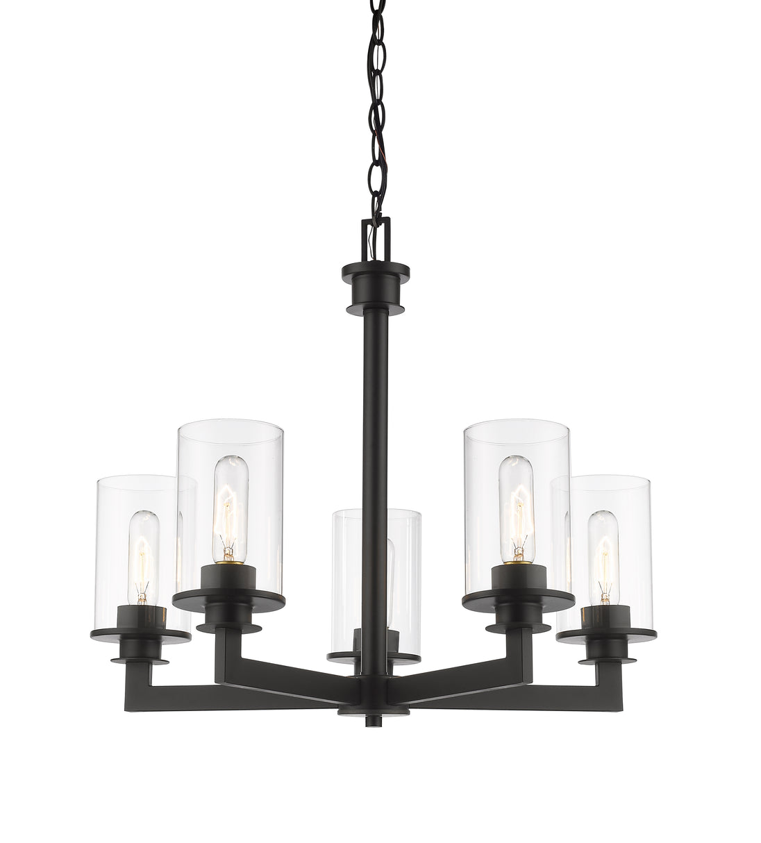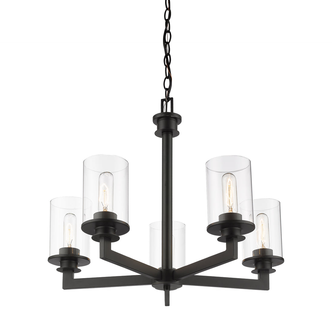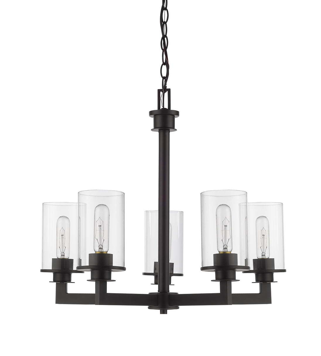 A touch of old world style gives this mid-century modern five-light chandelier elegant charm. A bronze finish emphasizes the glowing brilliance of the clear glass cylinder-shaped shades.
