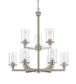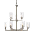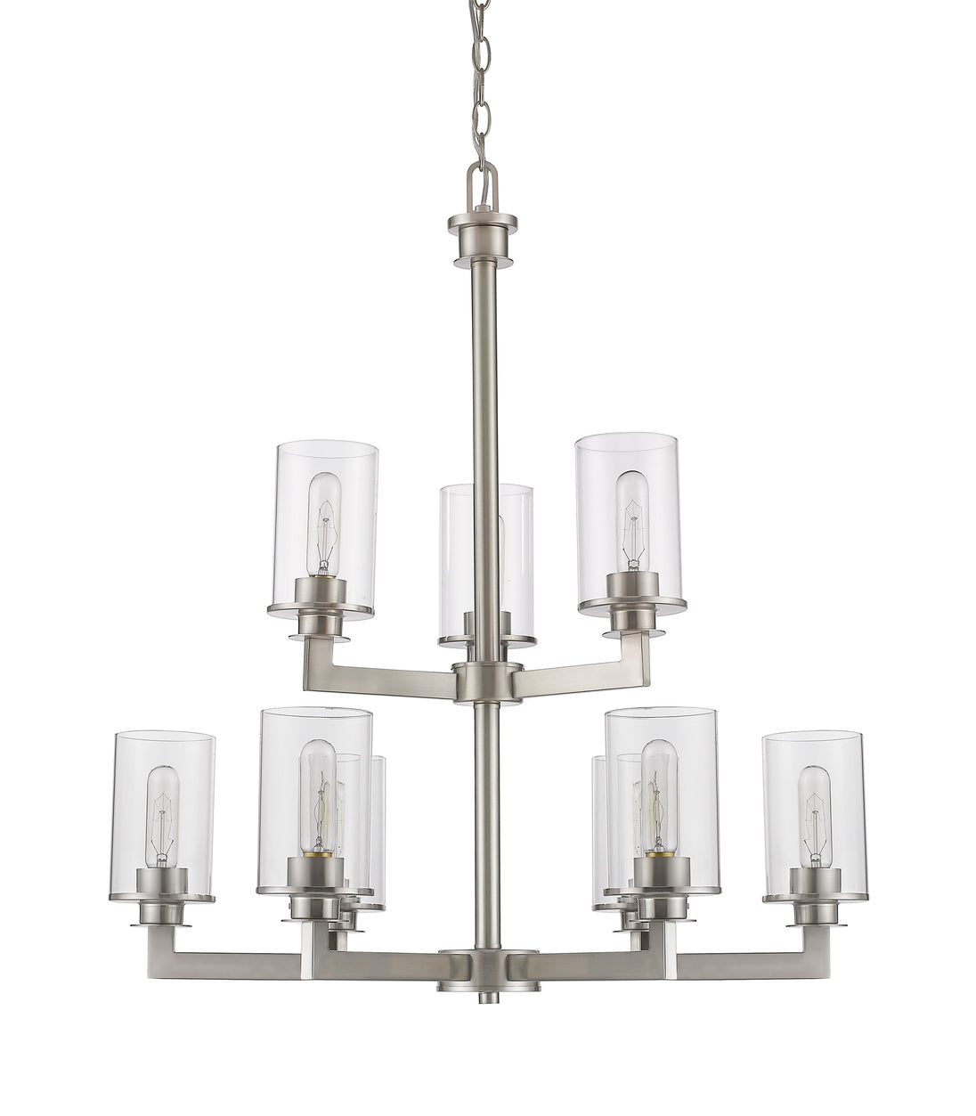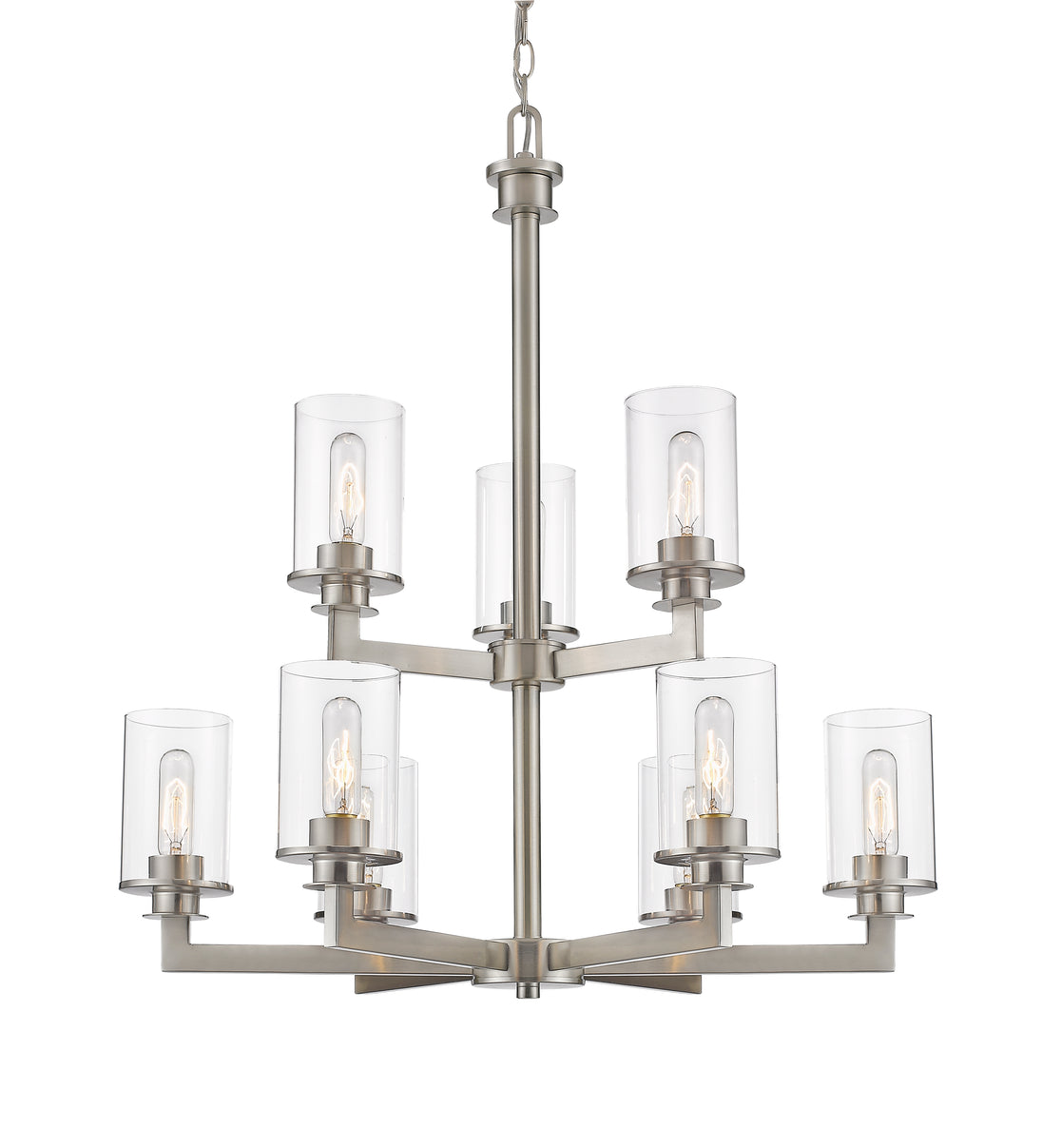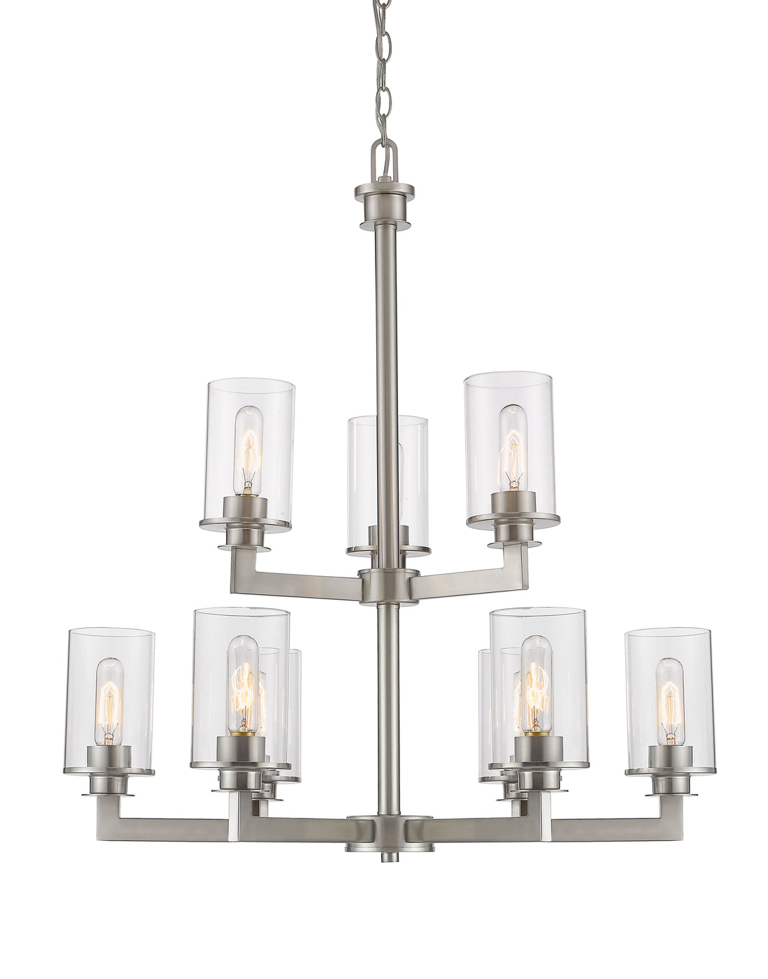 Modern art influenced style makes this mid-century modern nine-light chandelier glow with chic sophistication. A brushed nickel finish highlights the chic brilliance of the clear glass cylinder-shaped shades.