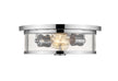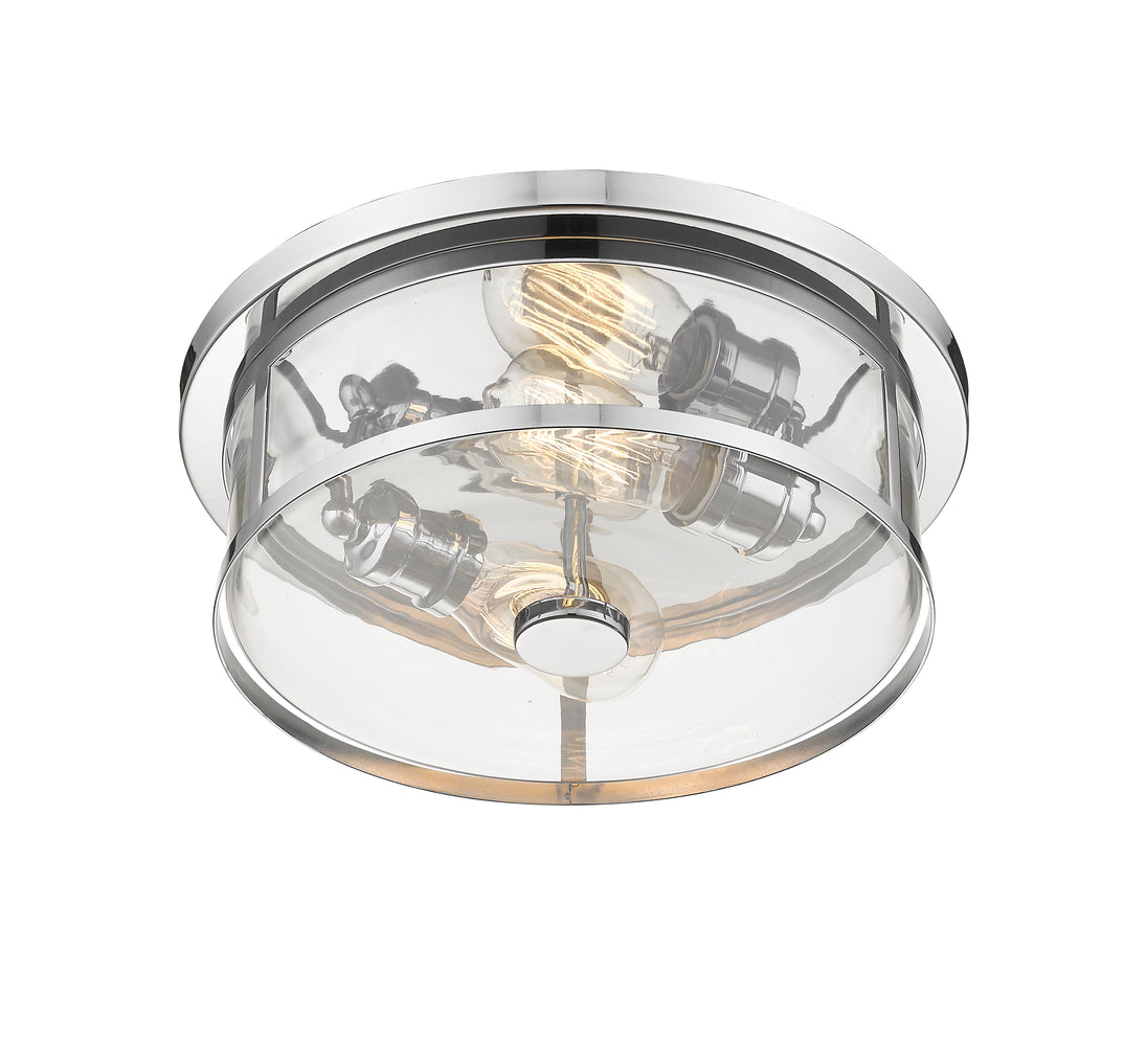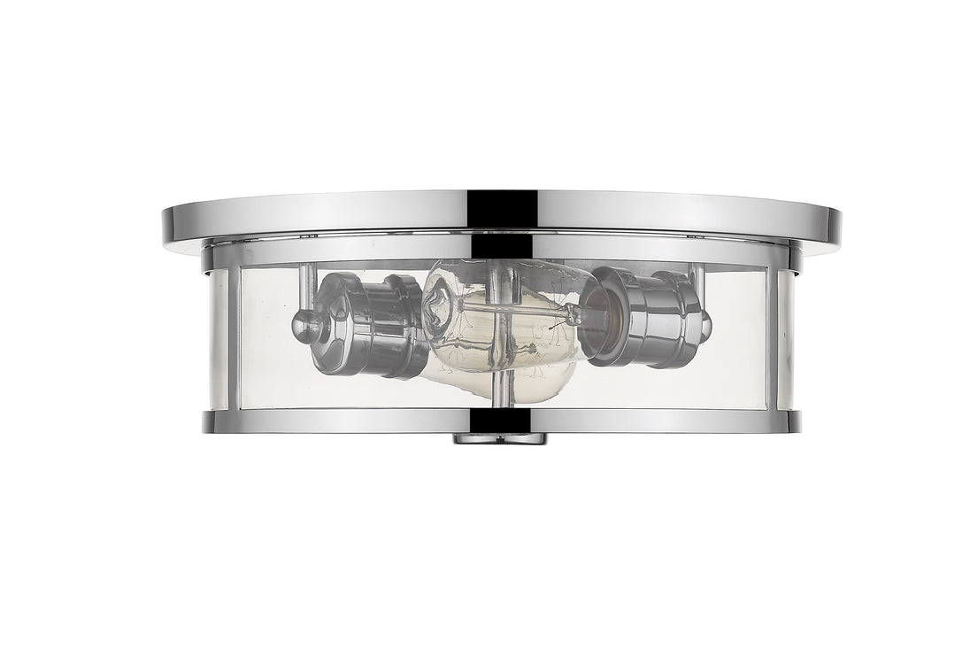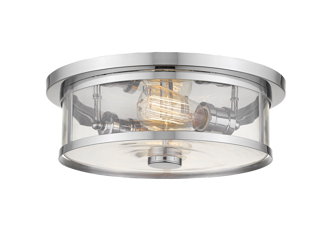 Purely mid-century modern, this two-light flush mount adds a certain panache to a living space. Luminously bold with a chrome finish underscoring the clear large glass cylinder shades.