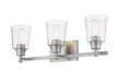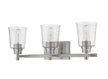 Dress up a guest bath with this enticing three-light vanity light. With a rugged frame finished in brushed steel and soft, romantic clear seedy glass shades, it offers a versatile ambiance that works in both contemporary and transitional décor schemes.