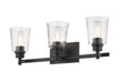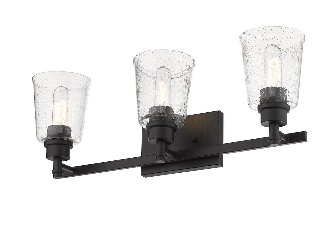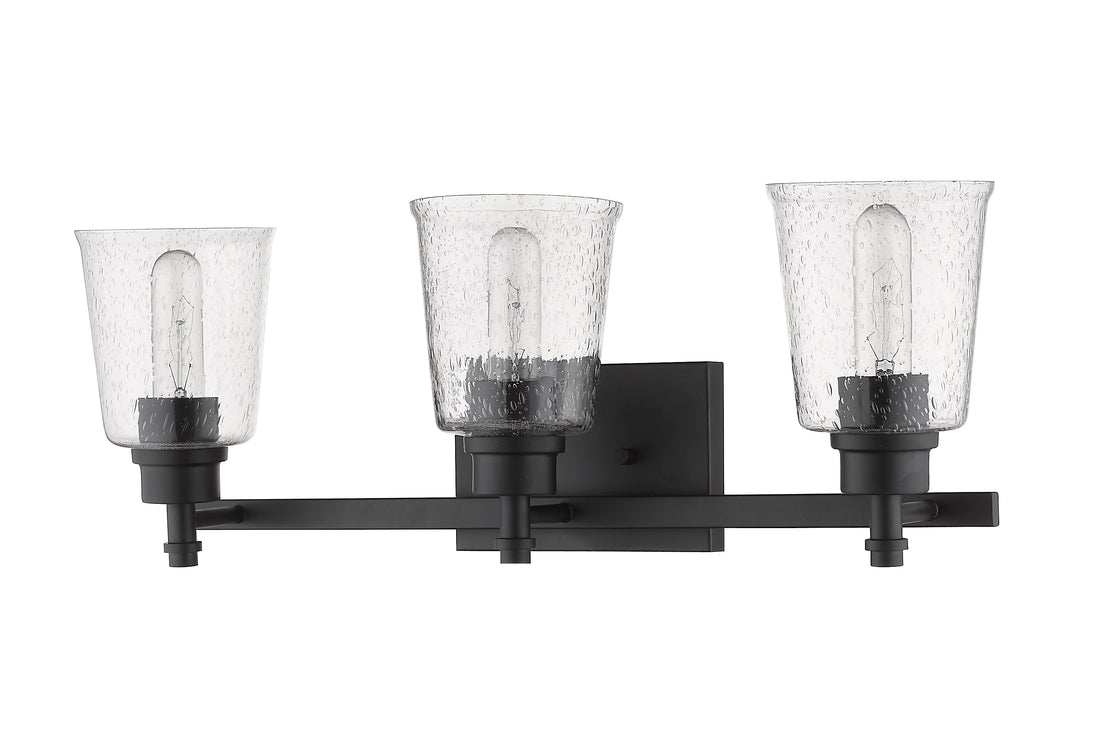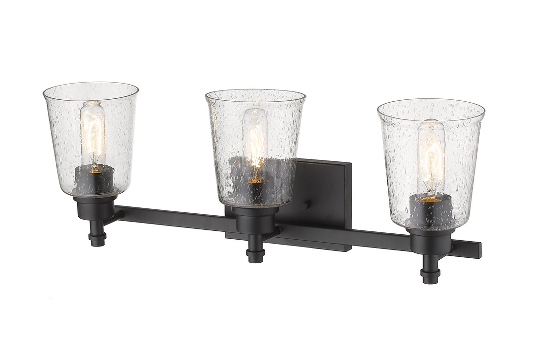 Call attention to floor-to-ceiling décor by placing this matte black two-three light vanity light in a guest bath space. A bold finish over rugged steel creates a frame that offsets the delicate look of clear seedy glass shades, delivering an ideal fixture for both contemporary and transitional spaces.