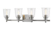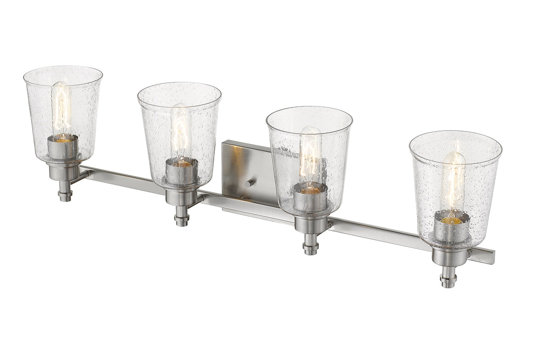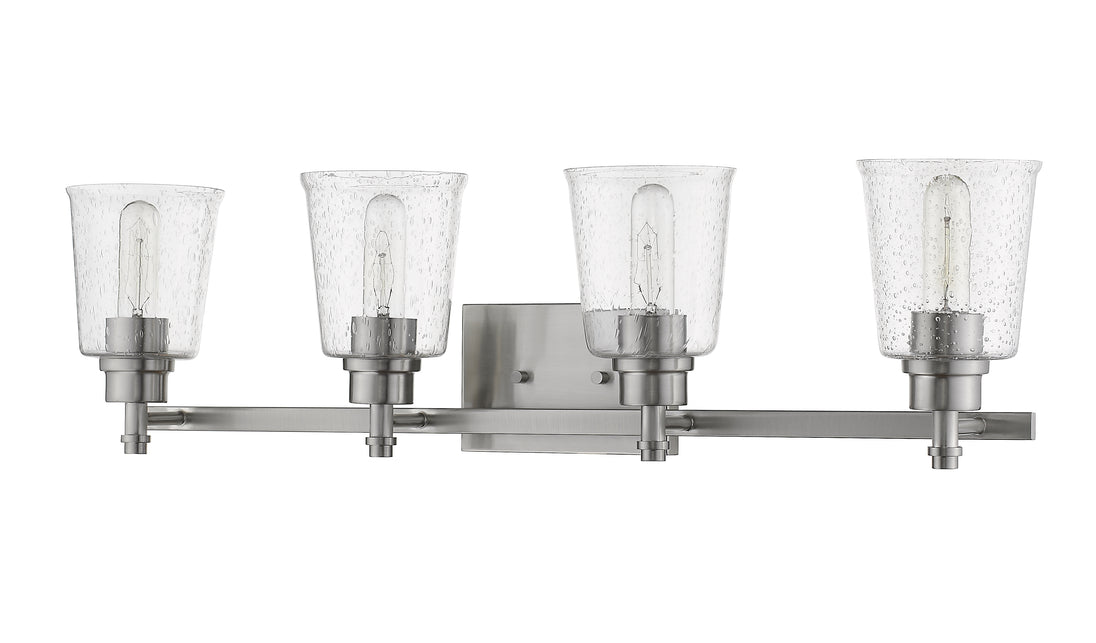 Frame a master or guest bath sink with elegance, and add this brushed nickel four-light vanity light to a new or remodeled bath space. Contemporary and transitional, its versatile motif hits on a beautiful blend of durable steel and soft, delicate bell shades fashioned from clear seedy glass.